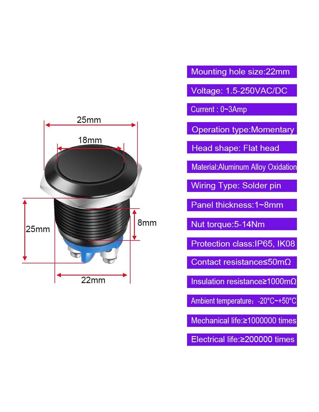 Clasificación del Interruptor: 3A 12V 24V 36 DC 110V 250V AC Tamaño del Orificio de Montaje: 22mm; Tipo de Operación: Momentáneo Color: Negro Forma de la Cabeza: Alta Redonda Tipo de Terminal: Tornillo Material del Cuerpo y Botón: Aleación de Aluminio Temperatura de Operación: -20C~ +55C Vida Mecánica: 1,000,000 ciclos, Vida Eléctrica: 200,000 ciclos Grosor del Panel: 1 - 10mm; Nivel de Protección: IP65, IK08 Contacto del Interruptor: 1NO (Normalmente Abierto)