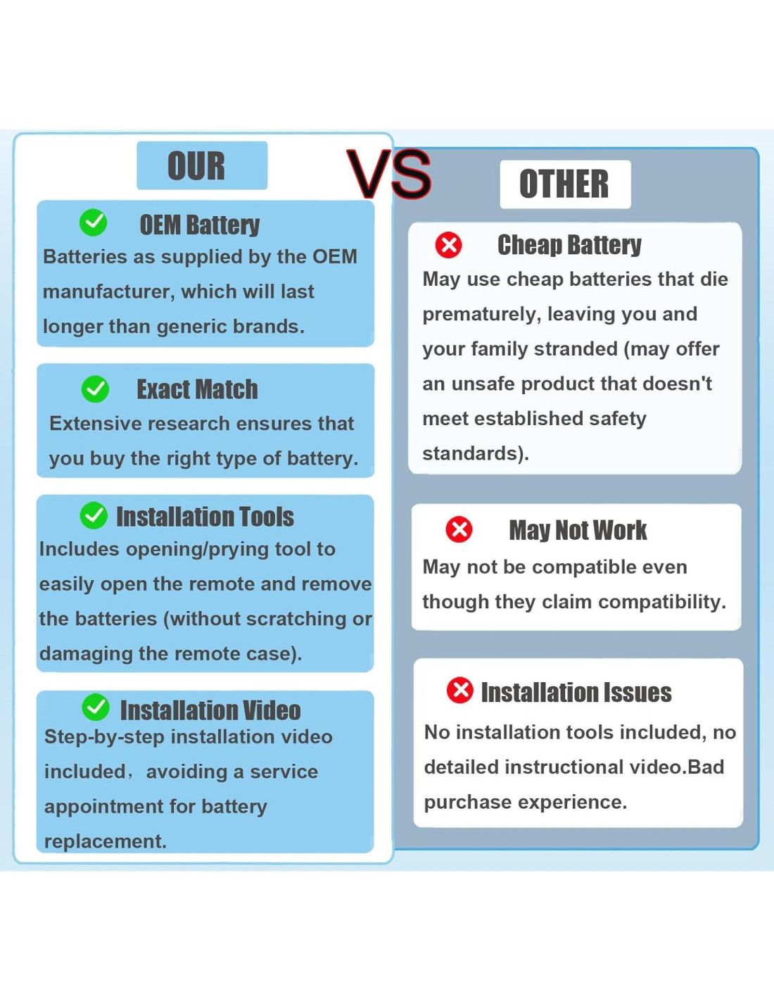 - ALTA SEGURIDAD Y FÁCIL INSTALACIÓN - Evita una cita de servicio para el reemplazo de la batería, no se requiere reprogramación remota. Herramienta de apertura/levante incluida para ayudarte a abrir la remota sin rasguñar o dañar la carcasa de tu remota.