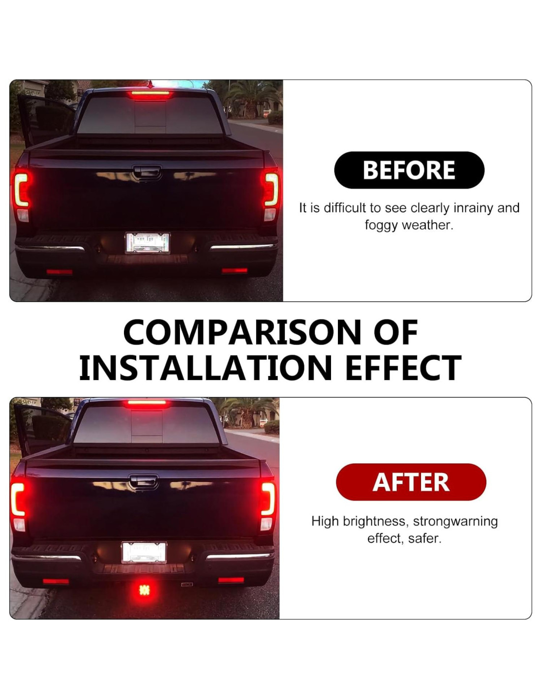 1. La luz trasera está equipada con 15 perlas de lámpara LED, con un efecto de iluminación brillante y uniforme, que puede mejorar la visibilidad del vehículo por la noche o en mal tiempo y mejorar la seguridad al conducir 2. Excelente rendimiento de sellado impermeable, carcasa de plástico de ingeniería, resistencia al impacto, protege efectivamente las perlas de lámpara LED internas y los circuitos 3. La bombilla viene con un arnés de cableado plug-and-play, que es fácil de conectar y no requiere modificaciones complejas en el cableado. El diseño sin polaridad simplifica los pasos de instalación