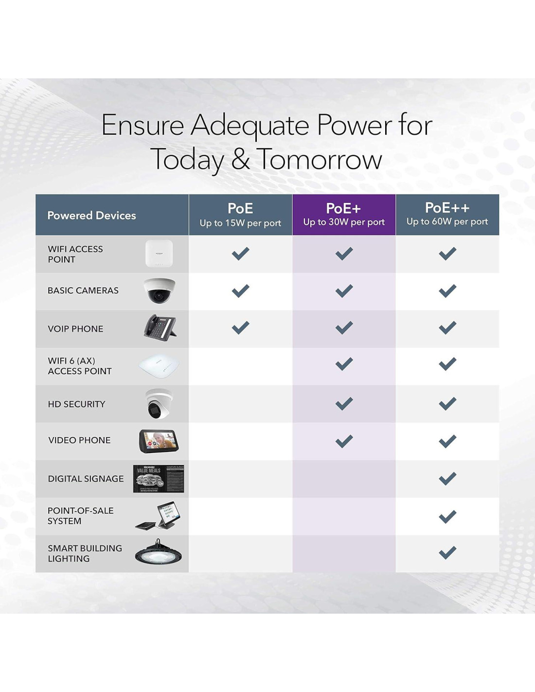 Presentamos el NETGEAR GS308PP Switch PoE+ No Gestionado de Ethernet Gigabit de 8 Puertos con un presupuesto PoE de 83W y tecnología integrada NETGEAR FlexPoE que permite aumentar el presupuesto PoE en cualquier momento para proporcionar a sus dispositivos la energía que necesitan con un adaptador de corriente externo intercambiable.