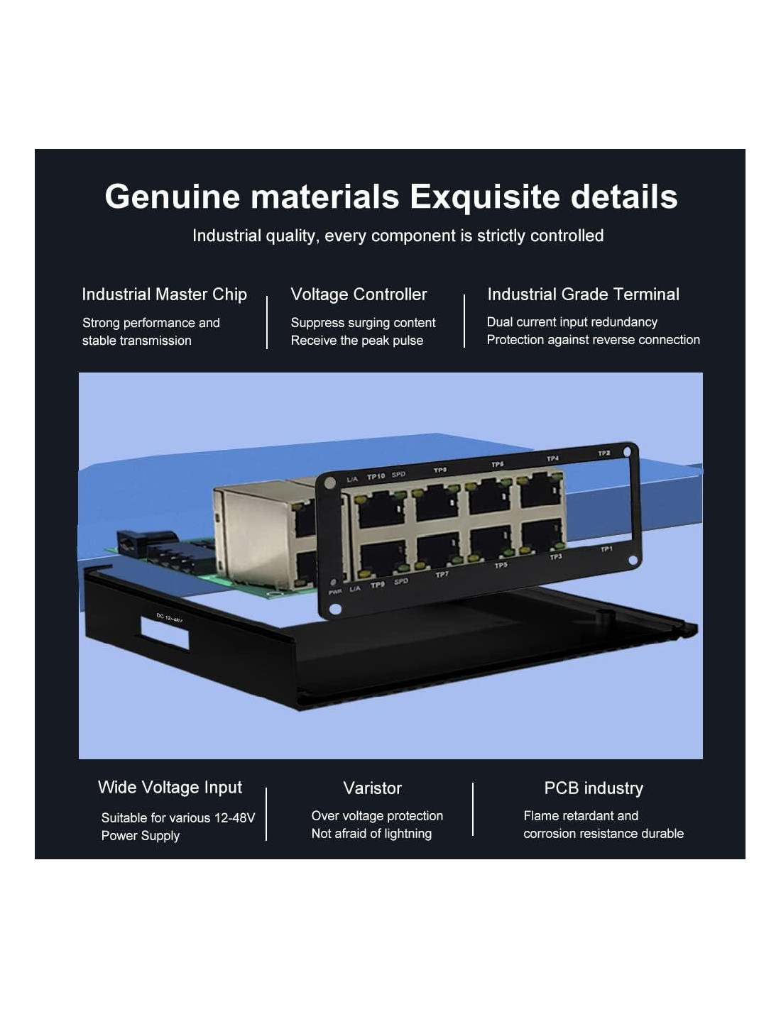 - 10/100/1000Mbps Ethernet - El Switch Ethernet Industrial de 10 puertos tiene 10 puertos RJ45 10/100/1000Mbps medio/completo dúplex.