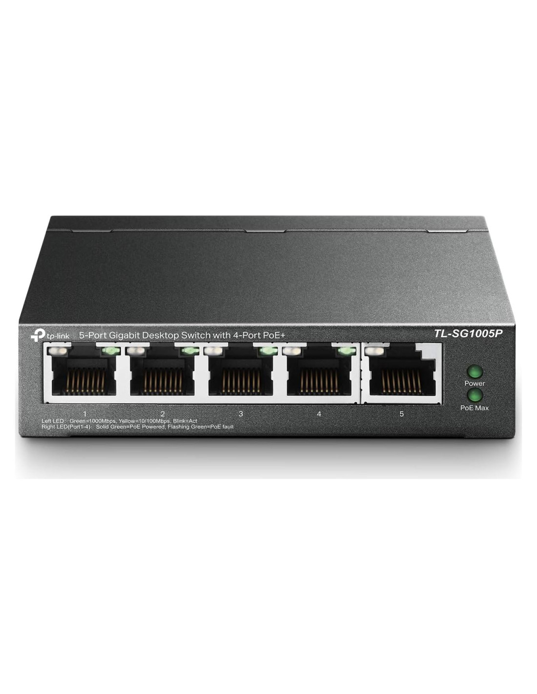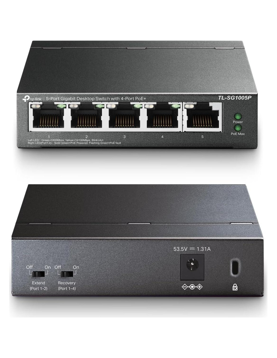 - [Configuración PoE Gigabit Completa y Flexible de 5 Puertos] 4x PoE+ (802.3at/af) 10/100/1000 Mbps puertos RJ45 que proporcionan hasta 30W por puerto y un presupuesto total de potencia PoE de 65W, junto con 1x Puerto Gigabit No PoE para conexiones de alta velocidad.