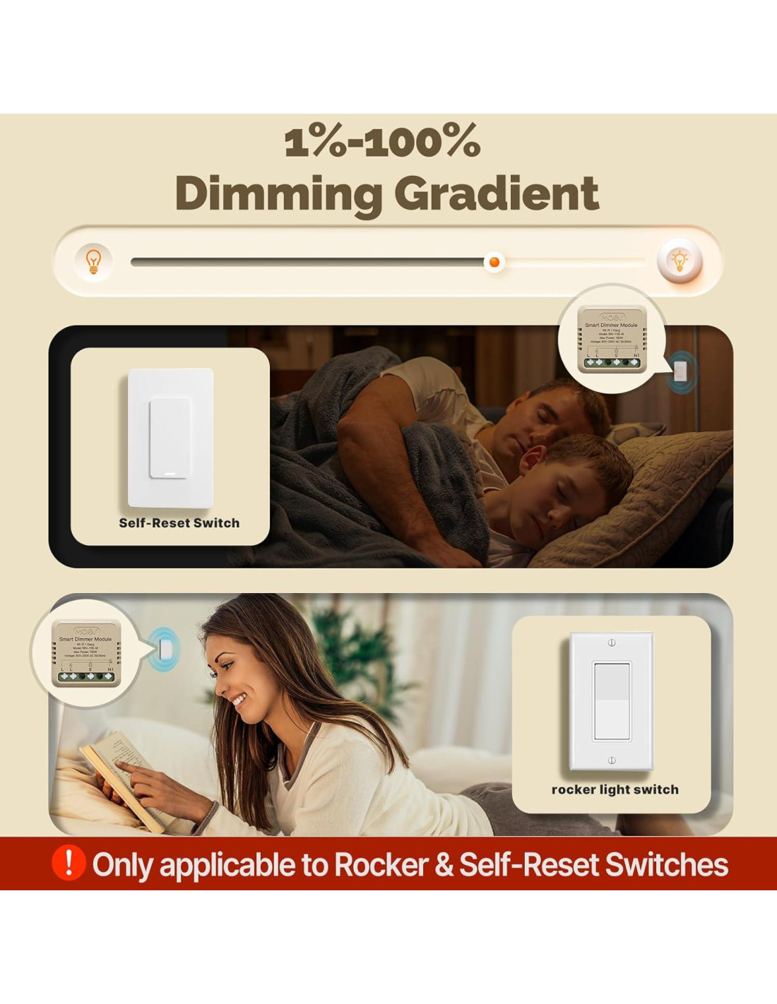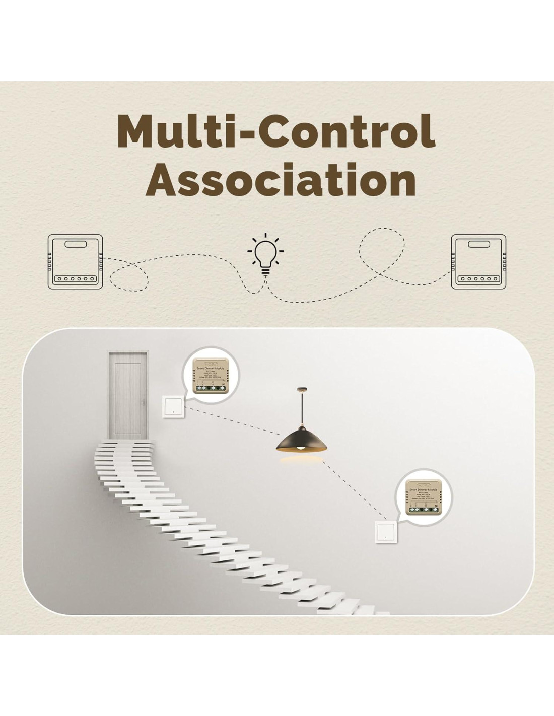 - CONTROL REGULABLE Disfruta de un brillo ajustable sin necesidad de un interruptor regulador adicional. Simplemente instala este relé wifi regulable, y tu interruptor existente se transforma en un regulador, ofreciendo iluminación personalizable para adaptarse a tu estado de ánimo.