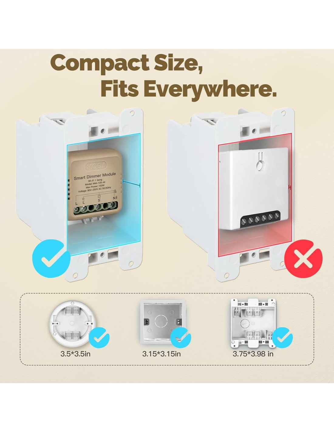 - DISEÑO COMPACTO Nuestro módulo de interruptor relé wifi cuenta con un perfil elegante con un grosor de apenas 1.78 cm (0.7 pulgadas), asegurando una integración sin problemas en cajas de interruptores estándar sin preocupaciones de tamaño.