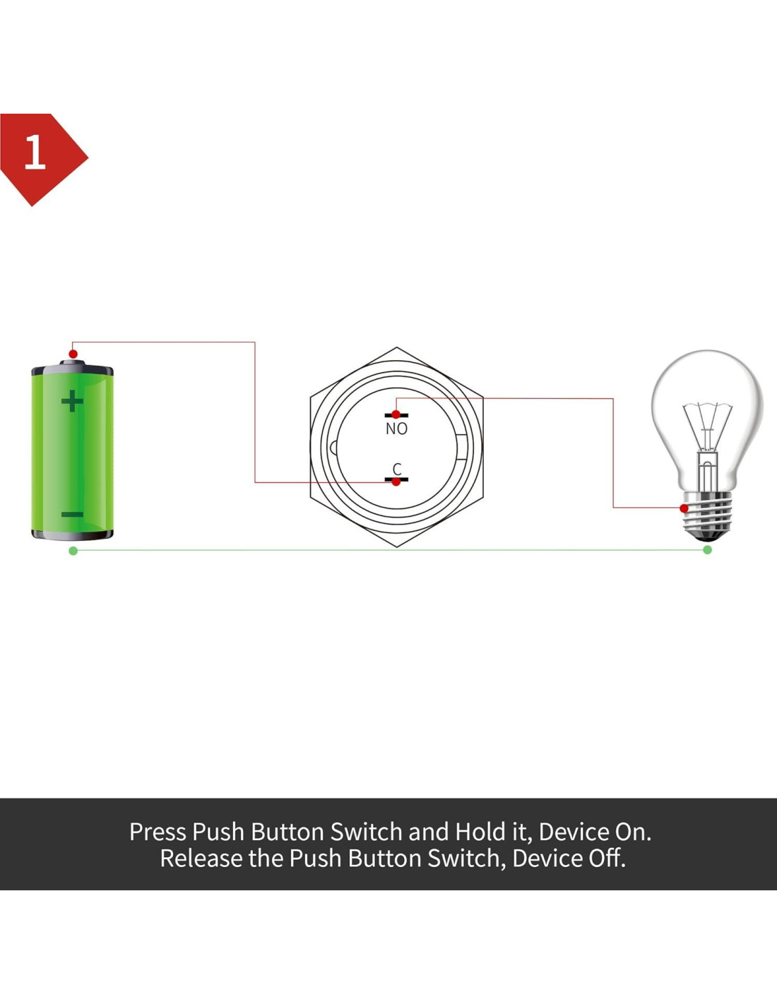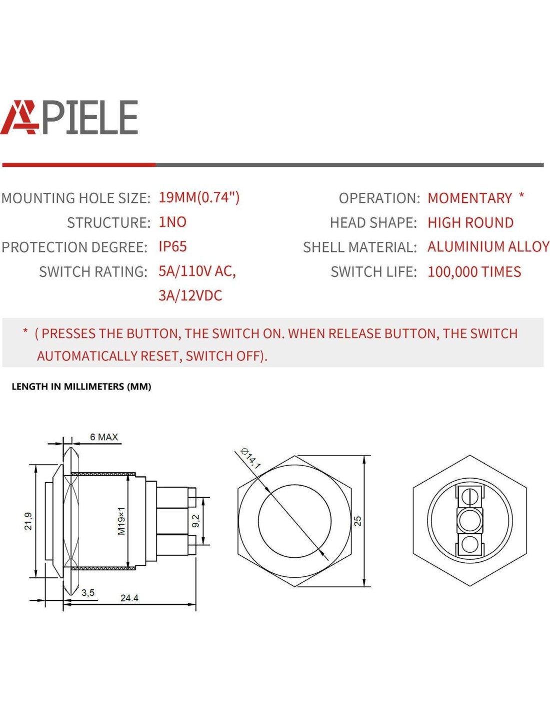 - Interruptor de Botón Momentáneo de 19mm: Presione y Mantenga, ENCENDIDO; Suelte, APAGADO, Configuración de Contacto: 1NO