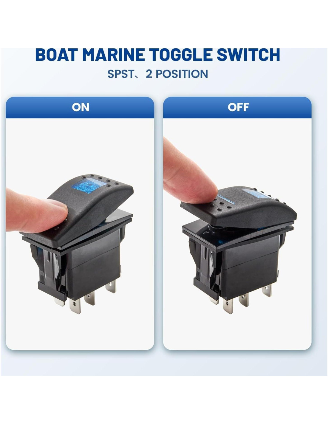 - Doble Luz LED: Comparado con uno de un solo LED, este interruptor de 2 posiciones 5PIN te permite decidir si el LED inferior está iluminado; El LED inferior siempre encendido puede ayudarte a localizar fácilmente el interruptor en un entorno oscuro cuando el interruptor está apagado; o el LED inferior también es controlado por el interruptor para evitar que los interruptores del barco agoten la batería.