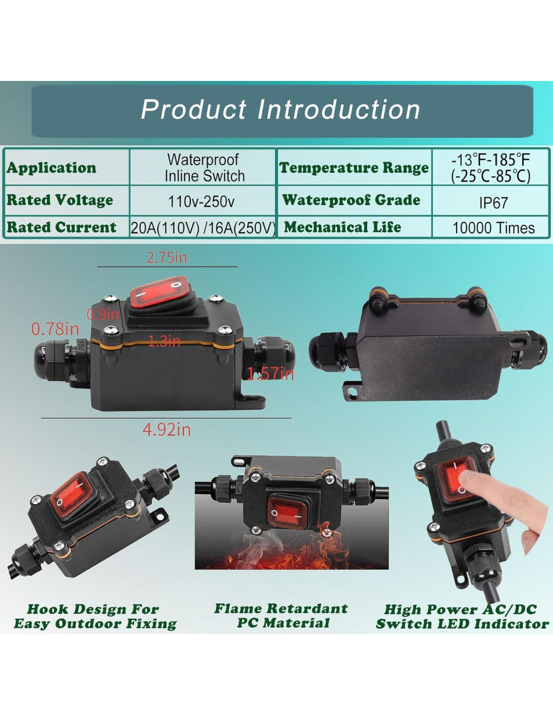 - ALTA CALIDAD: La vida útil de nuestro interruptor en línea a prueba de agua es de más de 10000 veces. Carcasa de material PA66 retardante de llama de alta resistencia, caracterizada por alta resistencia a la tracción, retardante de llama y aislamiento eléctrico, muy robusta, gruesa y duradera, con calidad confiable.