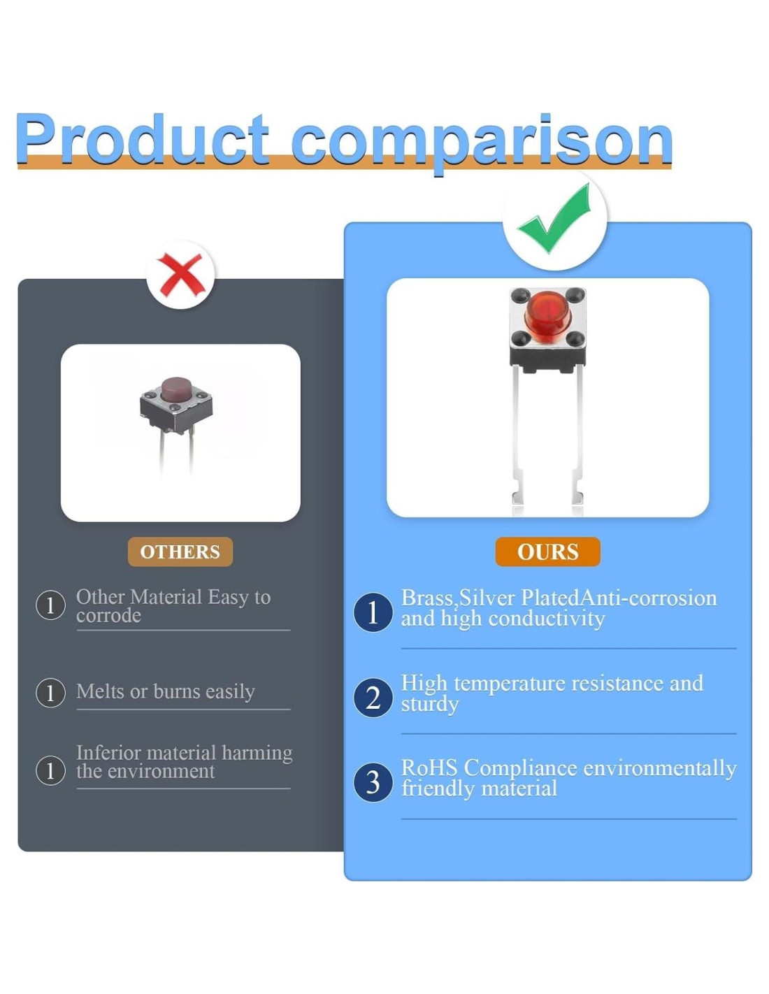 Interruptor Táctil Momentáneo a Presión de 6mm 2 Pin Color del botón: rojo Carga nominal: DC12V 0.1A Resistencia de contacto: <0.03 Voltaje de resistencia: AC250 V (50Hz) /MIN Fuerza de activación: 1.3+/-0.5N Resistencia de aislamiento: >100M Temperatura de funcionamiento: -30~85C Vida útil: Más de 10000 clics Paquete: Empaque en caja