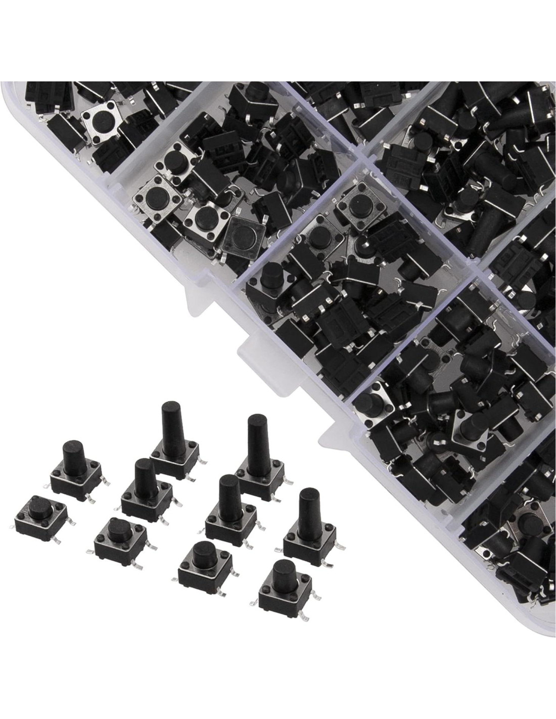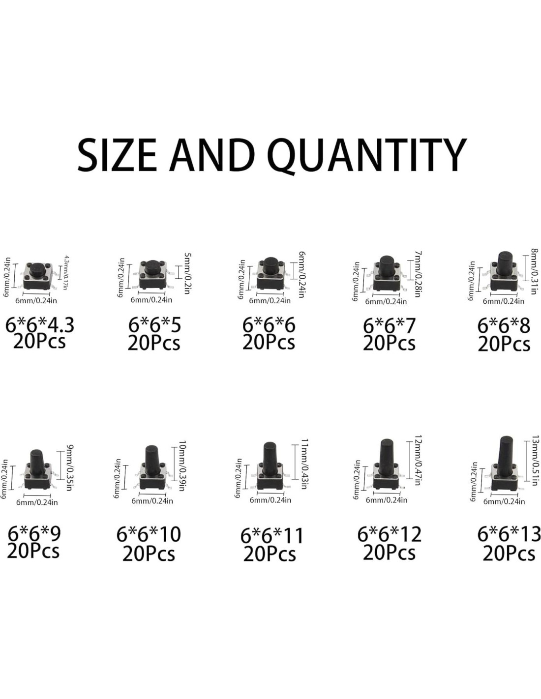 - CANTIDAD DE EMPAQUE: 200Pcs interruptor de botón táctil 10 Valores (Cada Valor 20Pcs), 6x6x4.3mm/5mm/6mm/7mm/8mm/9mm/10mm/11mm/12mm/13mm, clip--1Pcs.