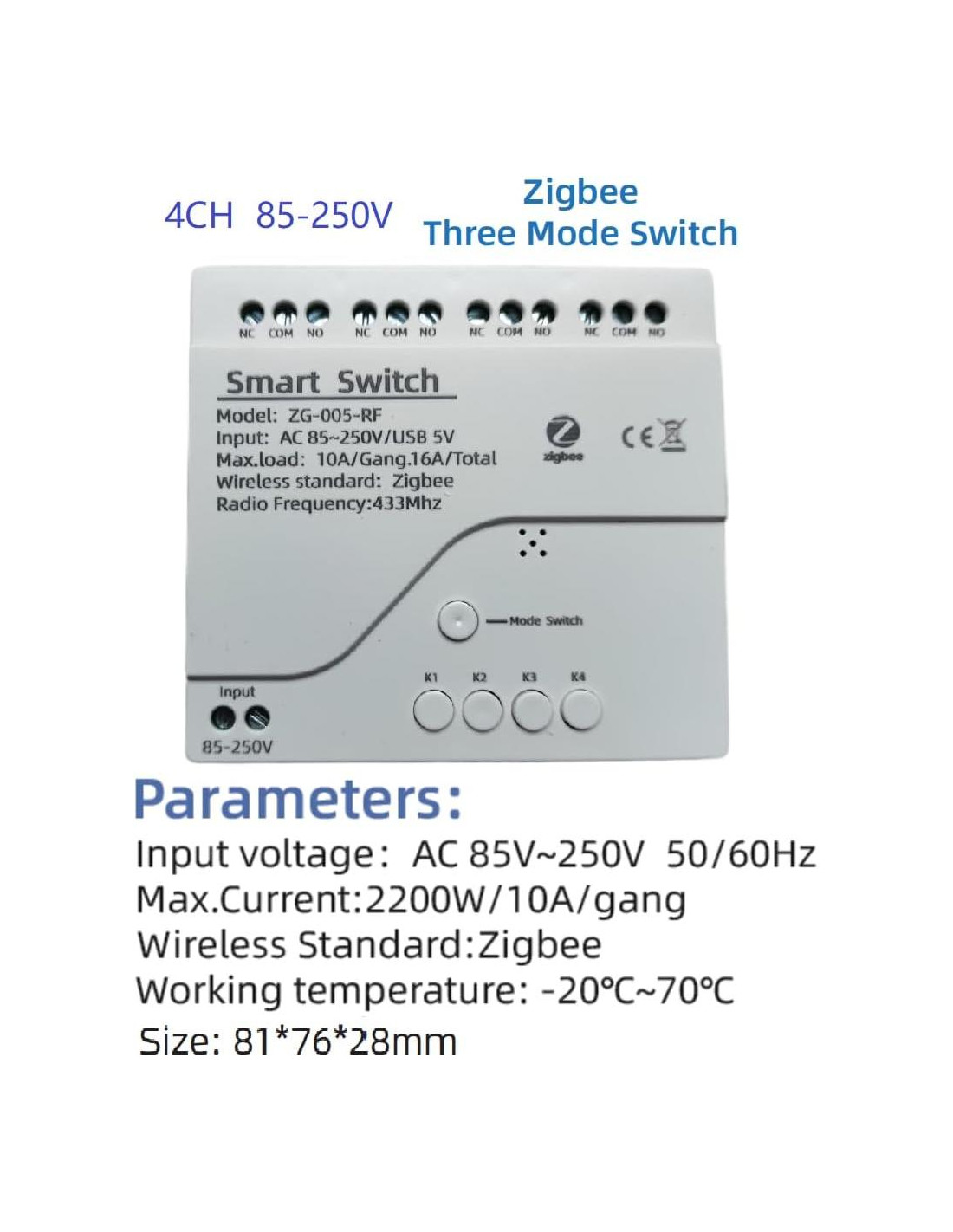 - Voltaje de trabajo DC 5V o AC85-250V, acepta energía a través de un micro-usb o terminales estándar. La energía no se pasa al circuito del relé. Es un contacto seco aislado encendido/apagado en la placa de relé momentáneo ZigBee. ZigBee IOT con controlador de interruptor encendido/apagado de bajo voltaje Zigbee, funciona como botón zigbee para abridor de puerta de garaje inteligente DIY con modo momentáneo