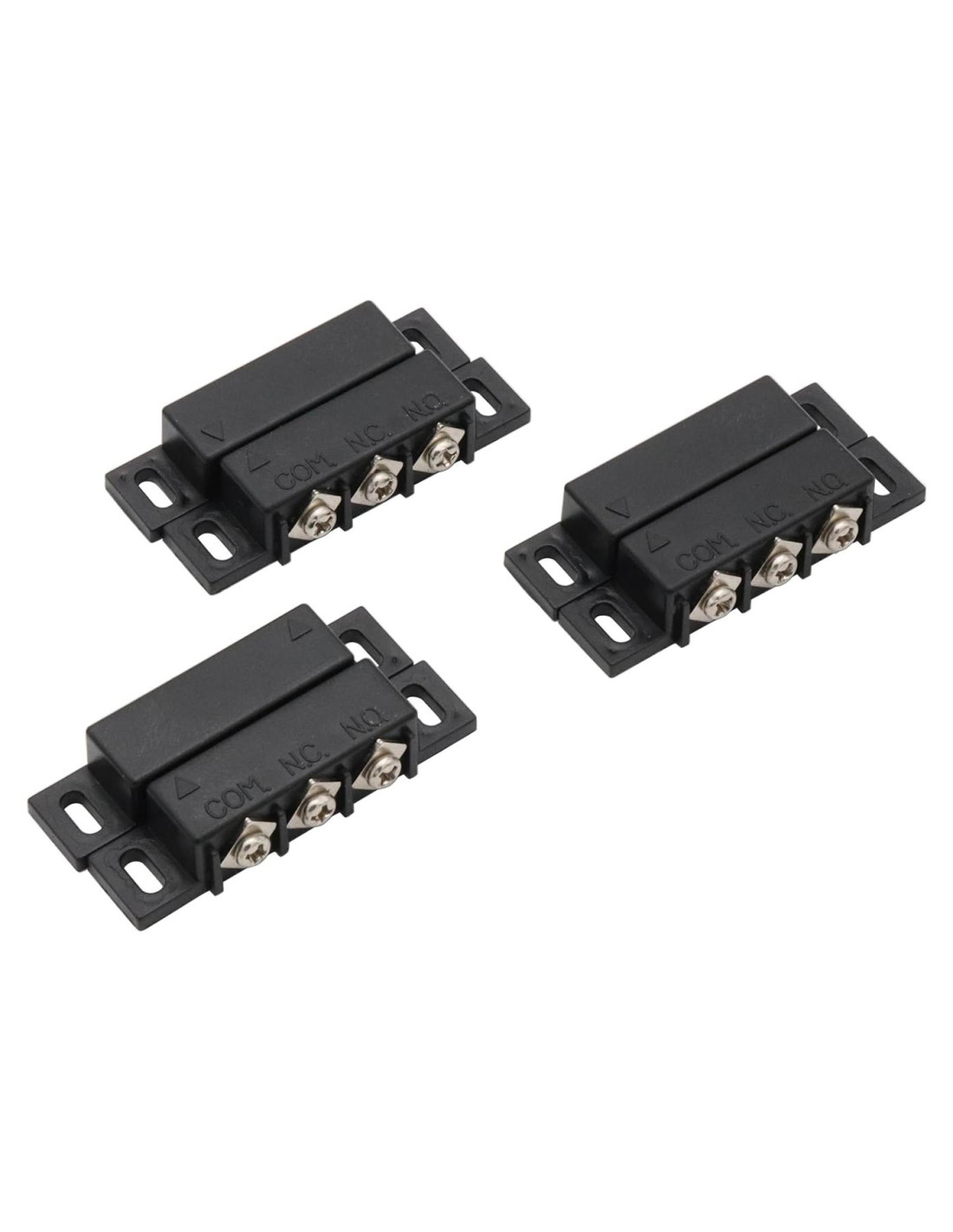 - Producto: - Voltaje de trabajo máximo: 100V - Corriente de trabajo máxima: 0.5A - Potencia de contacto: 10W - Distancia de detección: 15~25mm - Material: Carcasa de plástico ABS, imán - Color principal: negro - Paquete: - 2.17''x.51''-------3 juegos - Descripción: - Encapsulados en una resistente carcasa de plástico ABS, los interruptores son resistentes al desgaste, asegurando un rendimiento duradero. - Funciona a DC 5V, 12V y 24V, lo que lo hace adecuado para diversas aplicaciones de bajo voltaje. - El interruptor de lengüeta es un interruptor eléctrico operado por un campo magnético aplicado. - Cada interruptor cuenta con contactos normalmente abiertos (NO) y normalmente cerrados (NC), proporcionando flexibilidad para diferentes diseños de circuitos. - Ideal para alarmas, LED, relés, dispositivos de bajo voltaje GPS, etc.
