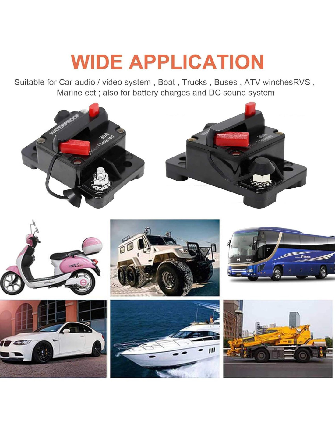 - PREVENCIÓN DE RÓTURA CON AMPLIO RANGO DE VOLTAJE: El interruptor de circuito de CC incluye una cubierta impermeable para prevenir la corrosión en partes metálicas. Con un amplio rango de voltaje (12V-48V CC), este interruptor de circuito de 30 amperios es versátil y adecuado para diversas aplicaciones