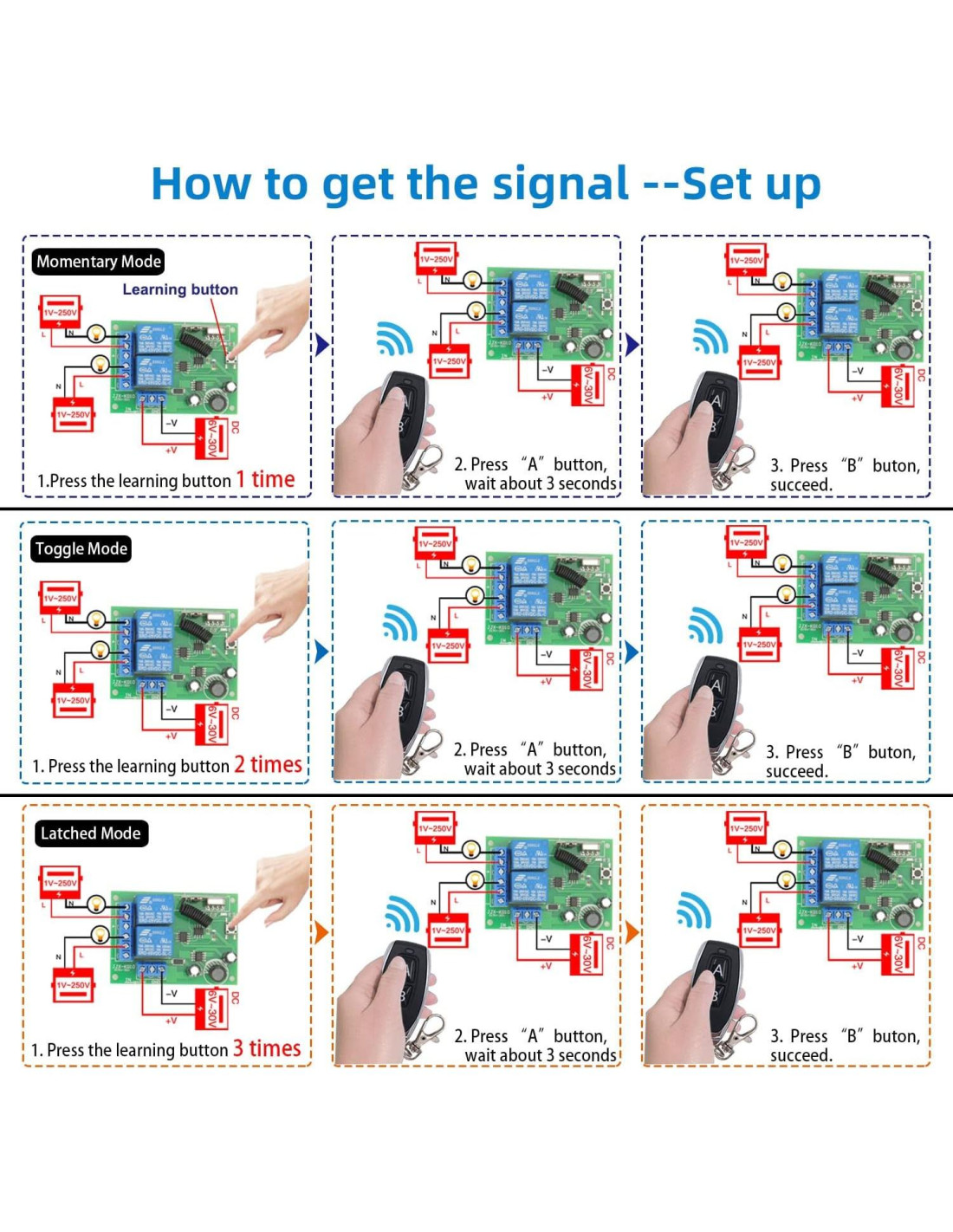 - [Más flexibilidad] Este receptor contiene 2 relés, y hay 3 terminales (normalmente abiertos, común, normalmente cerrados) para cada relé. Estos 2 relés son independientes, por lo que puede controlar cada uno de ellos de forma remota presionando el botón remoto. Cada receptor puede almacenar alrededor de 20 transmisores. Y un transmisor también puede controlar múltiples receptores (el transmisor necesita emparejarse con el receptor).