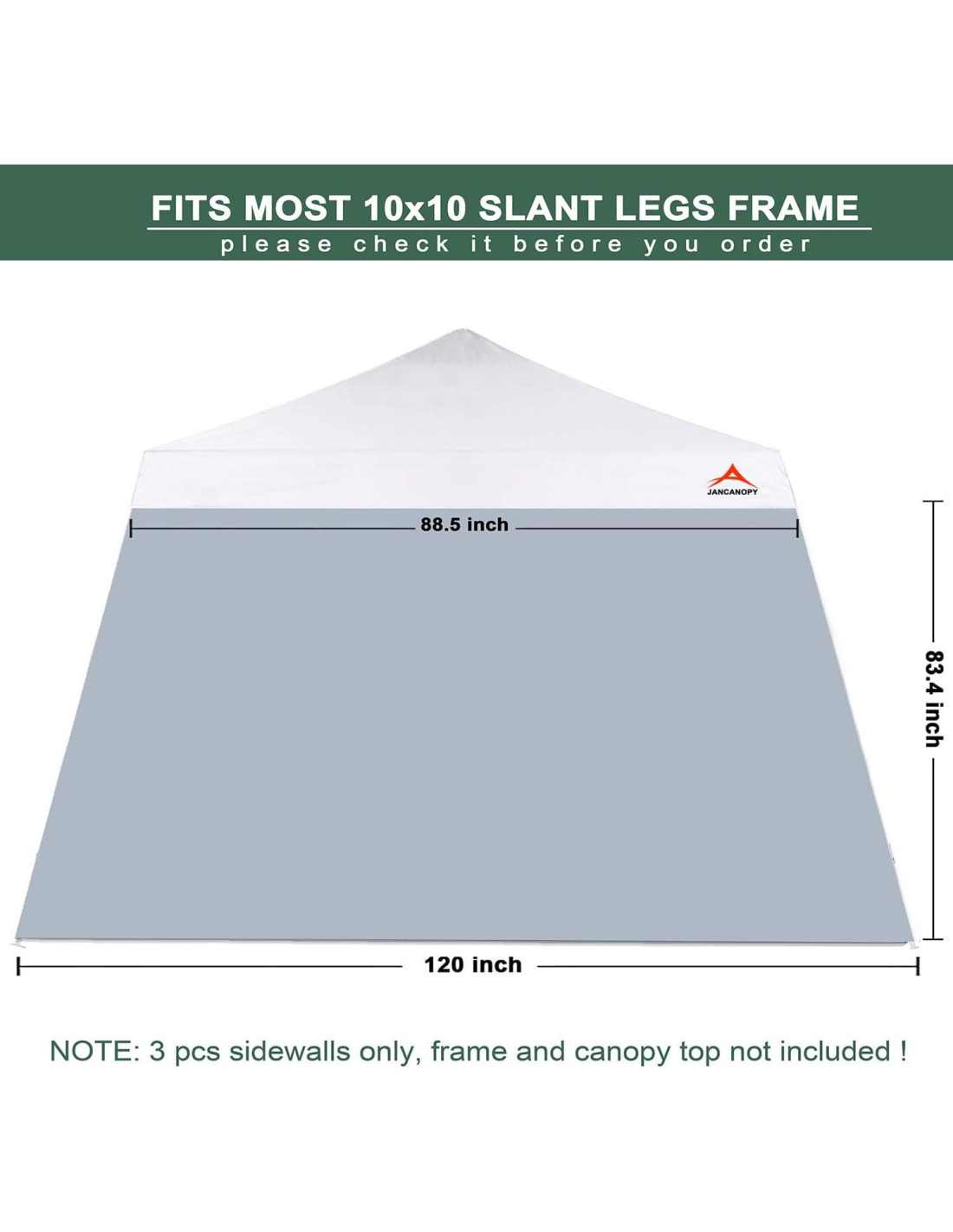 - DIMENSIÓN UNIVERSAL: Tamaño de la parte superior de la pared lateral 88.5 pulgadas (225.4 cm). Tamaño de la parte inferior 120 pulgadas (304.8 cm). Altura 83.4 pulgadas (211.5 cm) apta para carpas plegables de pierna inclinada de 10x10 pies (3.05 x 3.05 m) en el mercado. Asegúrese de que su carpa tenga un marco de pierna inclinada. "No es para ninguna carpa con pierna recta"