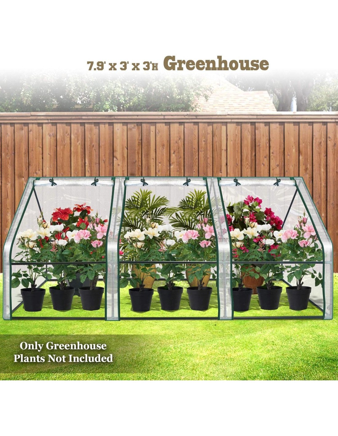 - Dimensiones generales del invernadero: 0.91m (L) x 0.91m (W) x 0.91m (H), 0.91m (L) x 1.83m (W) x 0.91m (H), 0.91m (L) x 2.41m (W) x 0.91m (H)