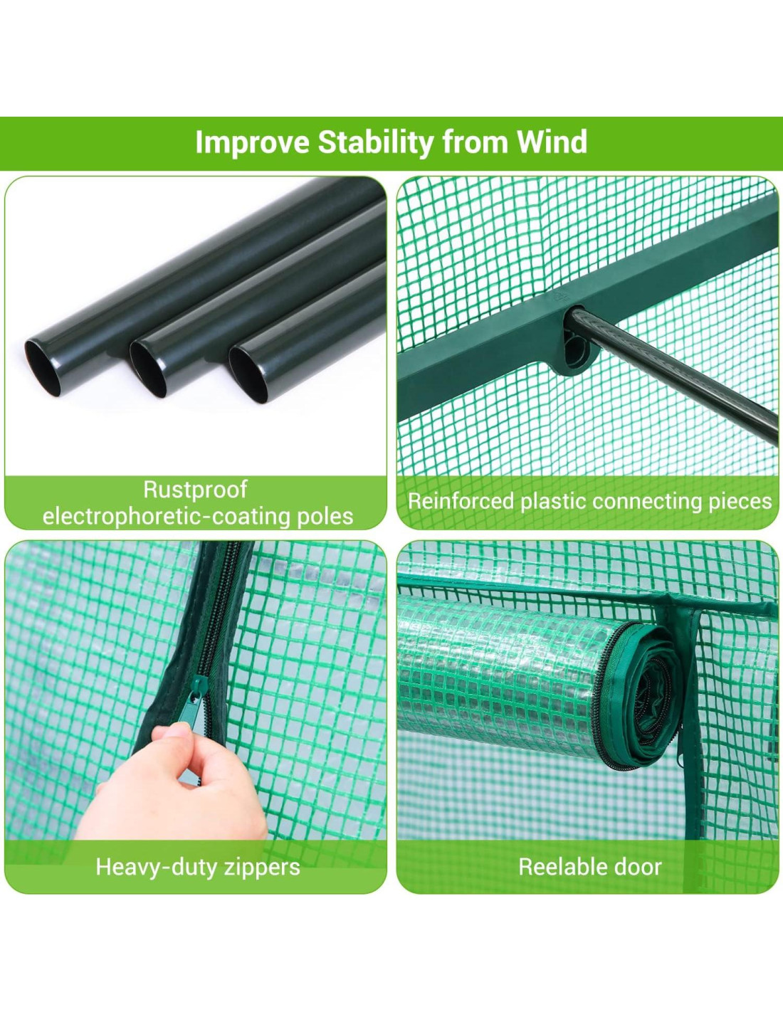 El Invernadero Mini Ohuhu está diseñado para crear el mejor ambiente para que tus plantas crezcan saludablemente, proporcionar protección contra condiciones climáticas adversas como lluvia, viento y nieve, y permitirte ejercitar tus dedos verdes en cualquier lugar y en cualquier estación. Todas las partes son desmontables, por lo que puedes montarlo tanto en interiores como en exteriores, y moverlo cuando cambien las estaciones. No se requieren herramientas. Aún así, es fácil quitar la cubierta exterior y usarlo como un soporte para plantas. Estructura de metal duradera con capacidad de carga máxima de 22 lb (9.98 kg), viene con clips para mejorar la estabilidad. Gran puerta enrollable conveniente para entrar y mejorar la ventilación. Cremallera suave y duradera con costura de dos agujas. Utilizando tecnología de procesamiento de electrorecubrimiento para permitir que los postes engrosados sean a prueba de óxido y con forma. Material plástico engrosado asegura la estabilidad del conector. Invernadero mini con Rueda Invernadero Pop Up Invernadero Mini Interior Invernadero Adosado Invernadero Mini Transparente Invernadero de Entrada Invernadero de Techo de Aguja ¡Extiende la temporada de crecimiento! Los postes de metal del invernadero Ohuhu son más gruesos y con mayor diámetro, lo que hace que todo el invernadero sea más sólido y estable. Proporcionamos una amplia gama de invernaderos. El material principal de la cubierta verde es PE, distribución en cuadrícula, que es más duradera, a prueba de desgarro y protección UV, mientras que la cubierta transparente está hecha de PVC, que tiene buena calidad de transmisión de luz y mejor valor ornamental.