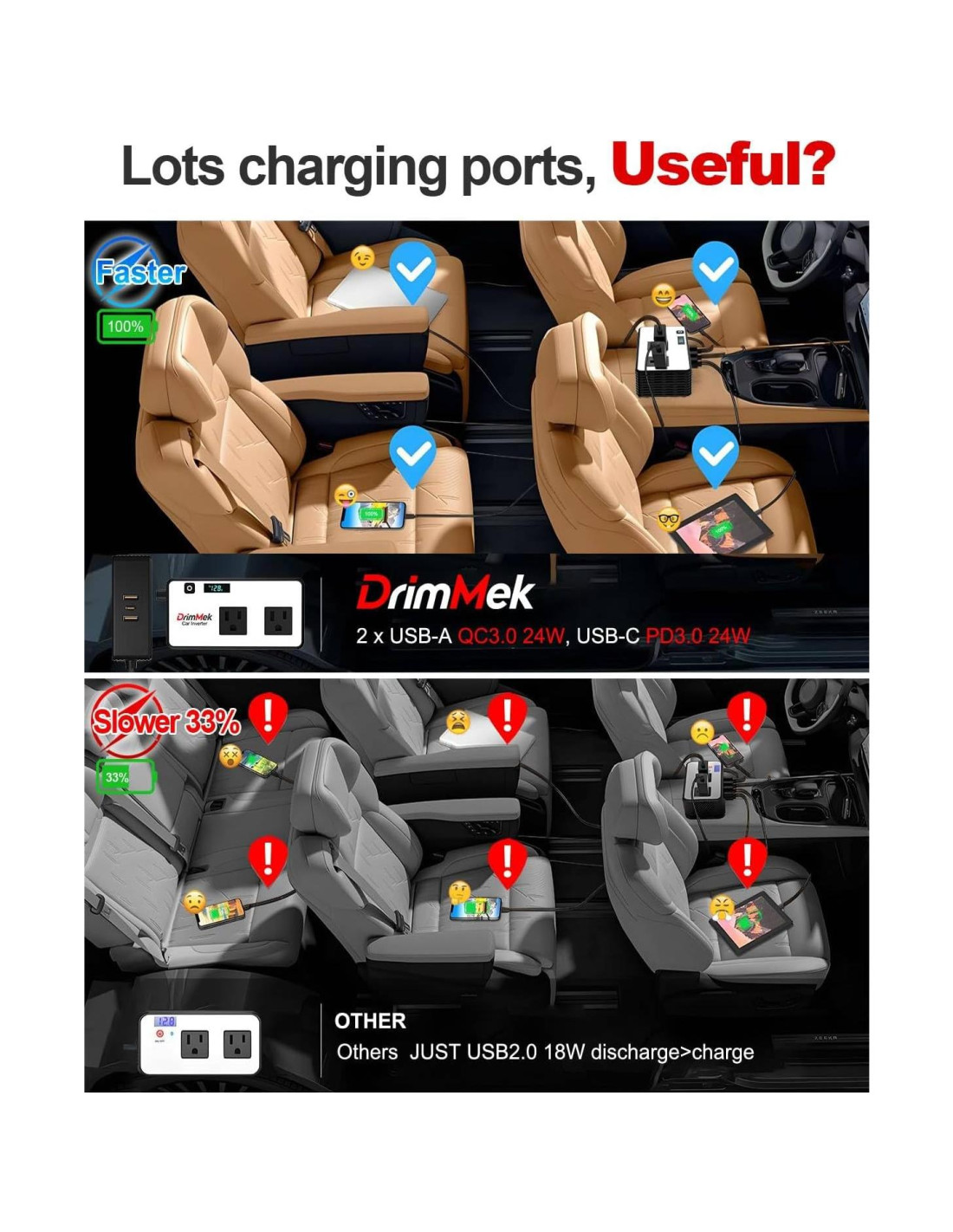 - Inversor de Potencia de Coche: 2 Enchufes de CA y 3 Puertos de Carga Rápida USB de 24W, ¡Carga un 35% más Rápido! Alimenta Laptops, Teléfonos, Aparatos de 200W - Ideal para Viajes por Carretera, Camping, Desplazamientos Diarios y Emergencias