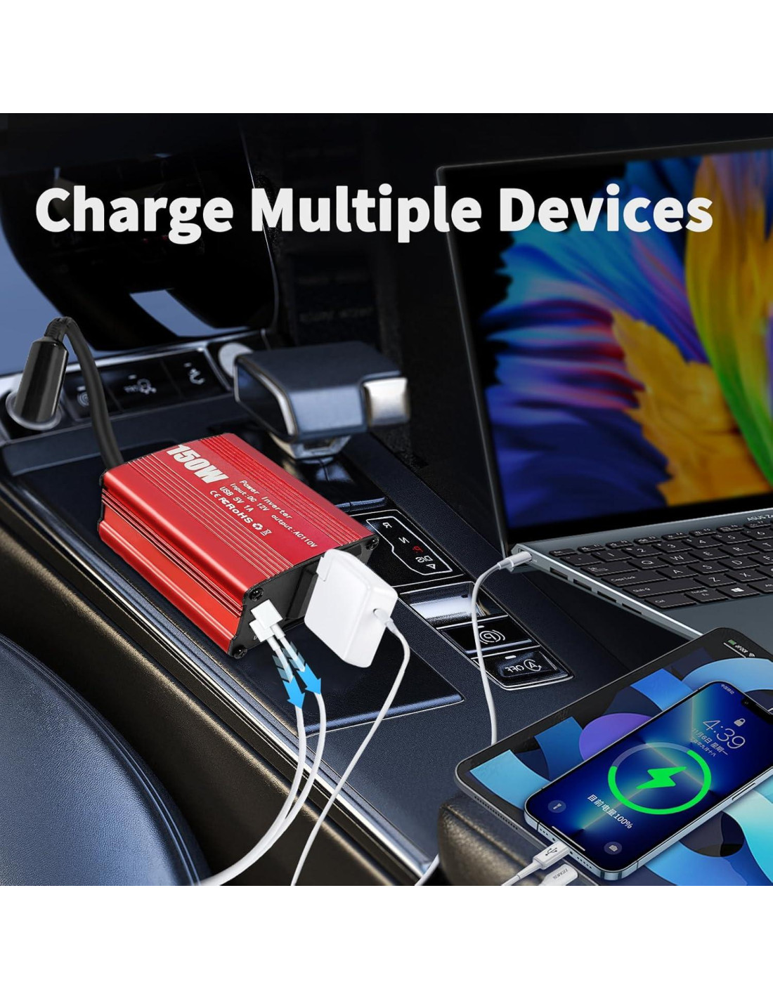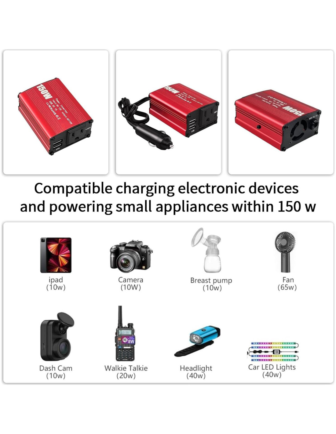 - Inversor de Potencia de 150W Premium: El Inversor de Potencia de Coche Proporciona 150 vatios de potencia continua de DC a AC y 300 vatios de potencia máxima. Ideal para cargar luces de cadena, portátil, extractor de leche, máquina CPAP, nebulizador, consola de juegos, TV, reproductores de DVD, luces, iPad y otros dispositivos electrónicos