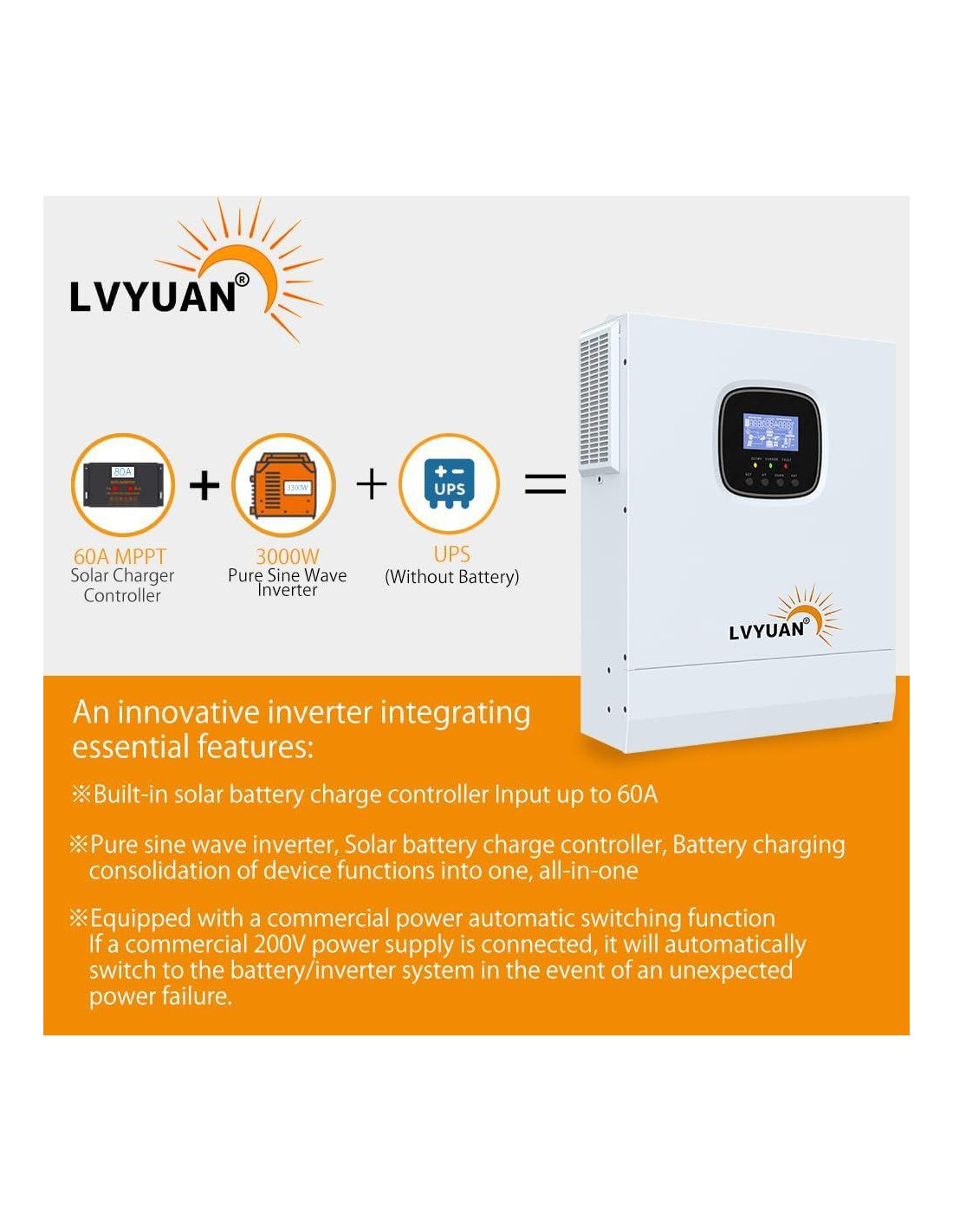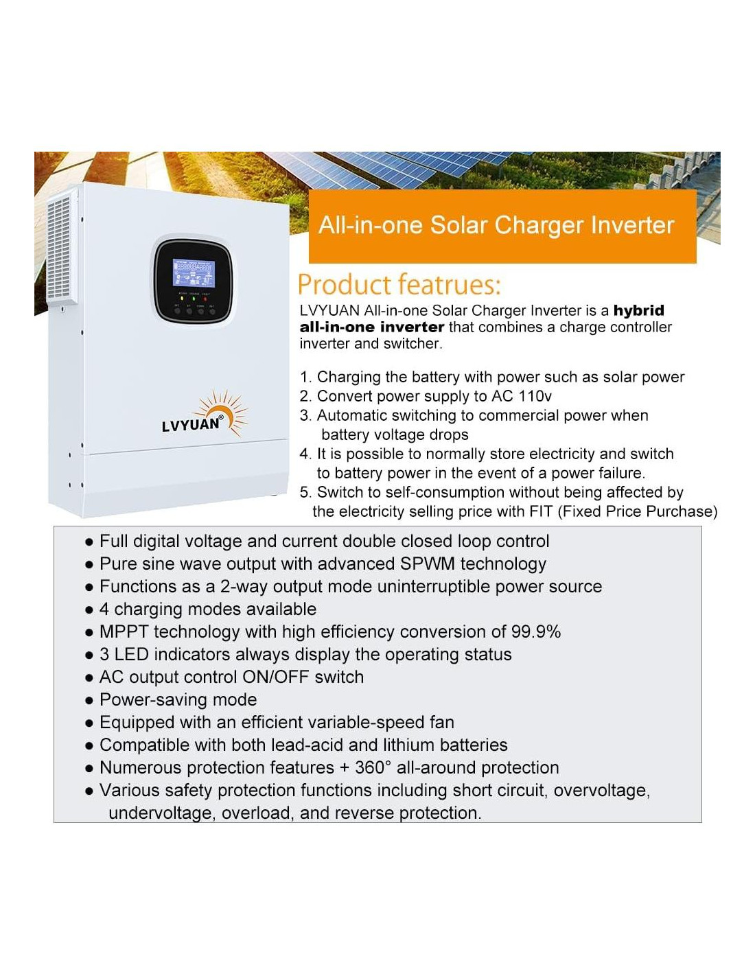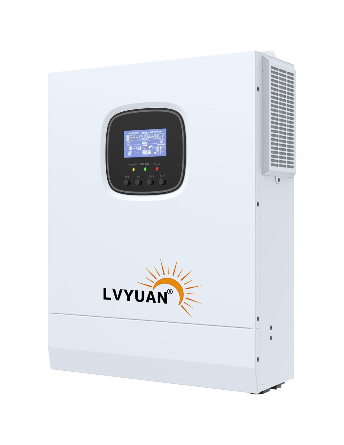 Inversor híbrido LVYUAN, utilizado en conjunto con baterías de 24V y paneles solares, puede construir un sistema de energía AC120V/3000W. El inversor de carga solar todo en uno LVYUAN es un inversor controlador de carga.