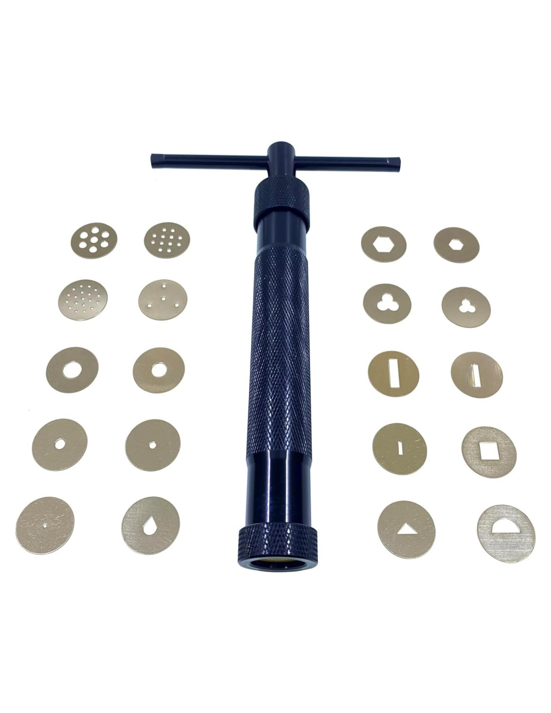 - Material: acero inoxidable. Nuestra extrusora de arcilla se puede usar con gomitas. Se puede usar para decorar galletas y pasteles.