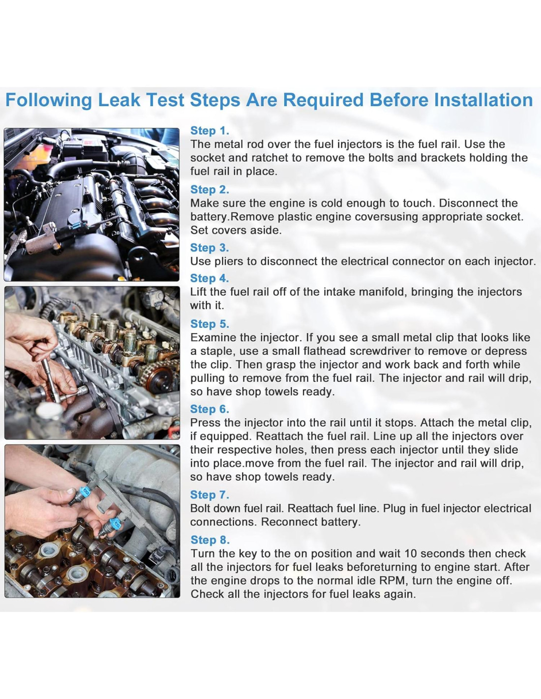 - Se recomienda encarecidamente la instalación profesional: Los inyectores de combustible afectan directamente la relación aire/combustible del motor y los nuevos inyectores de combustible requieren una nueva o actualizada afinación. También sugerimos que verifique el otro componente del motor antes de la instalación.