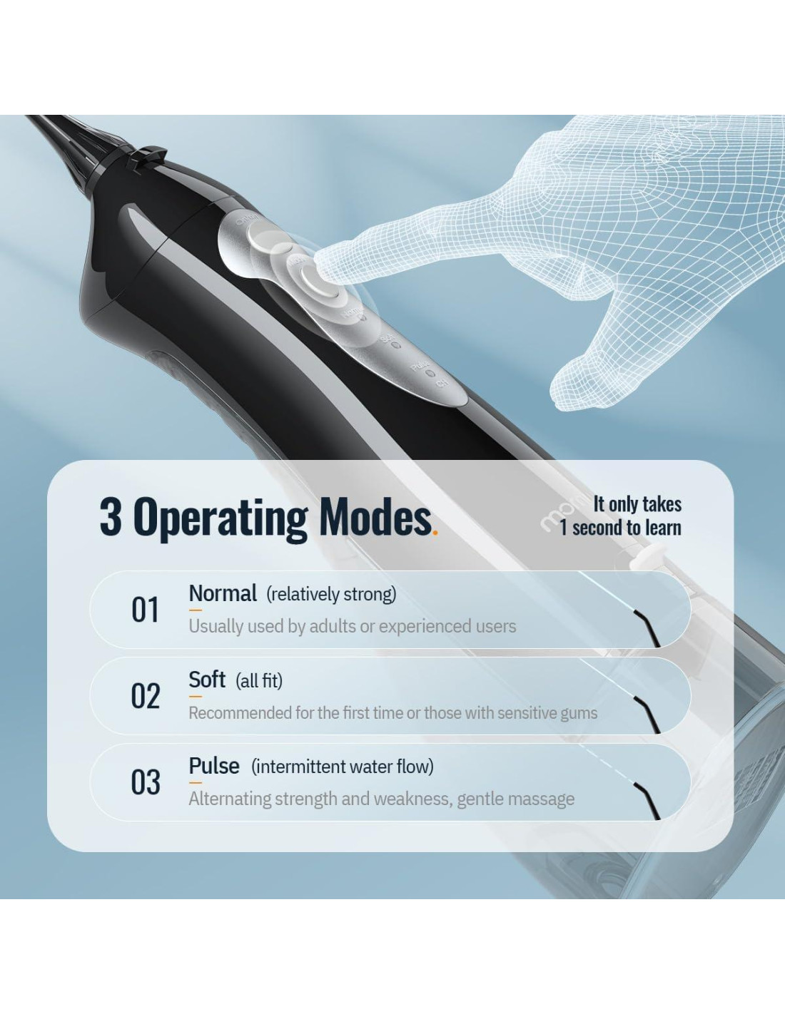- Función de Memoria de 3 Modos y a Prueba de Agua IPX7. El hilo dental Mornwell tiene 3 modos de limpieza diferentes, Normal, Suave y Pulso para satisfacer sus necesidades de cuidado oral. El diseño de AUTO-TIMER y la protección a prueba de agua doble interna y externa IPX7 es más seguro para usar el hilo dental en la ducha.