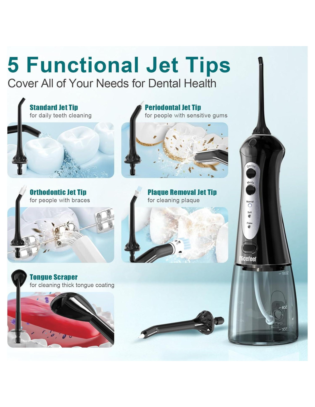- 3 Configuraciones de Presión y 5 Consejos Funcionales para Satisfacer Tus Necesidades: El irrigador dental portátil sin cable ofrece 3 configuraciones de presión y 5 consejos con rotación de 360. Esto permite una experiencia de hilo dental personalizada, ya sea que un nuevo usuario necesite una limpieza suave o busque una limpieza más profunda, una tarea en la que Nicefeel realmente sobresale.