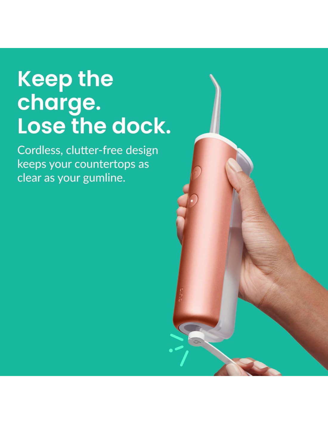 - Diseño Inalámbrico y Sin Desorden: El diseño sin desorden de nuestro flosser de agua inalámbrico mantiene tus encimeras tan claras como tu línea de encías. Simplemente conecta el cable de carga según sea necesario. Se carga en 4 horas y dura hasta 8 semanas (cuando se usa en modo suave, diariamente)
