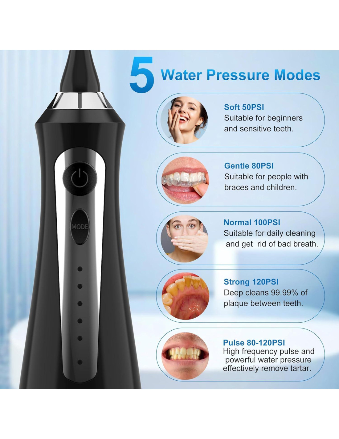 - [5 Modos de Limpieza para Tu Elección] : Suave (40psi) - para niños o usuarios primerizos. Suave (60psi) - para limpieza suave de encías sensibles. Normal (100psi) - para limpieza efectiva. Fuerte (120psi) - para personas que tienen altas exigencias de limpieza dental y de encías. Pulso - Masaje de encías, cambio de velocidad de 40 y 120PSI. Por favor, elige el modo suave cuando uses este irrigador dental eléctrico por primera vez.