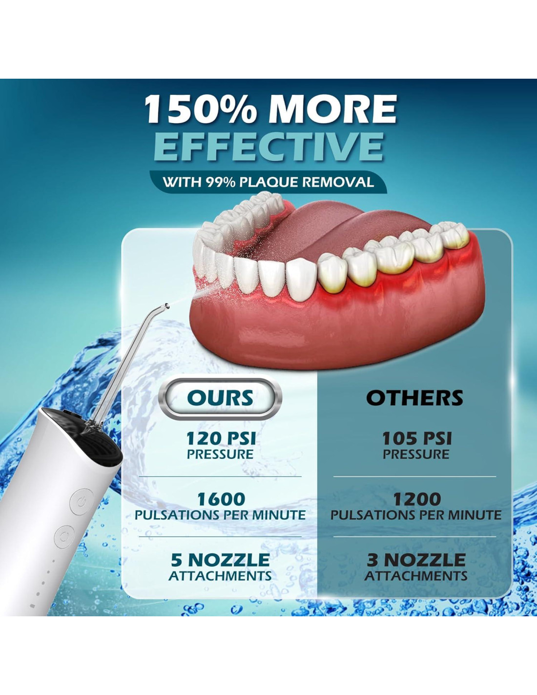 - Potencia y Precisión en Cada Pulso - Experimenta una limpieza verdaderamente superior gracias a la potente presión de agua de 120 PSI a 1600 pulsos por minuto, incorporada en nuestros flossadores de agua para dientes. Diseñado expertamente para eliminar la placa y las partículas de comida en segundos.