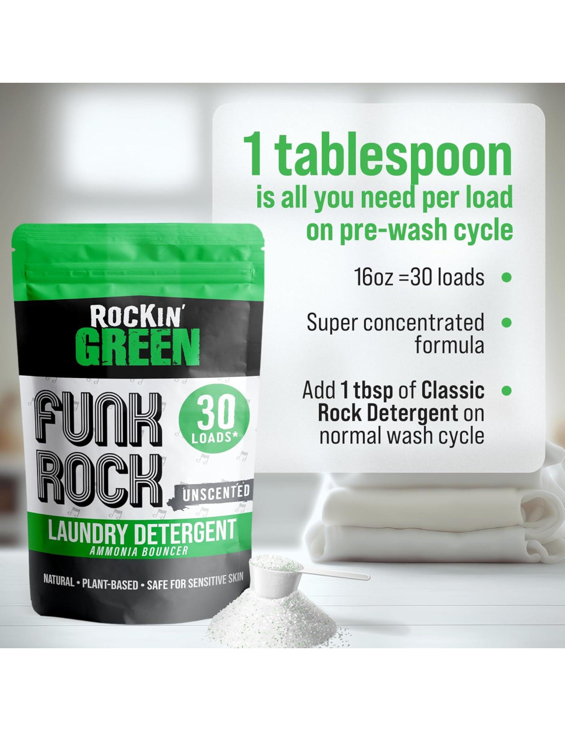 Formulado con ingredientes a base de plantas, este detergente en polvo para ropa combate olores difíciles de sudor, manchas, suciedad corporal, sangre y más, dejando tu ropa fresca y prístina. Con su fórmula altamente concentrada, un poco rinde mucho, proporcionando más de 30 cargas de limpieza profunda. Además, es seguro para todas las lavadoras, hipoalergénico para pieles sensibles y libre de productos químicos dañinos, asegurando que tu ropa se mantenga vibrante y libre de olores. ¡Di adiós a enmascarar olores - este increíble eliminador los elimina en la fuente, dejándote con nada más que ropa limpia, brillante y libre de olores cada vez! Rockin Green Funk Rock Ammonia Bouncer cuenta con la mejor eliminación de olores de la industria, conquistando sin esfuerzo incluso los acumulamientos más obstinados y antiguos. Nuestra fórmula a base de plantas penetra profundamente, eliminando acumulaciones de manchas desagradables para revivir la frescura original de tu ropa. Mantén el brillo de tus prendas blancas y la vitalidad de tu ropa de colores brillantes. ¿Y la mejor parte? Gracias a nuestra fórmula extra concentrada, solo se necesita una cucharada para obtener resultados sobresalientes. ¡Abraza el poder de nuestro detergente y redefine tu experiencia de lavandería hoy! Descubre la solución de lavandería ecológica definitiva con los productos Rockin Green, elaborados con un profundo compromiso tanto con tu bienestar como con el medio ambiente. Nuestros ingredientes libres de crueldad y veganos aseguran que cada carga de lavandería no solo sea segura para ti, sino que también tenga un impacto positivo en nuestro planeta. ¡Adopta una rutina de lavandería más verde y sin culpa con Rockin Green!