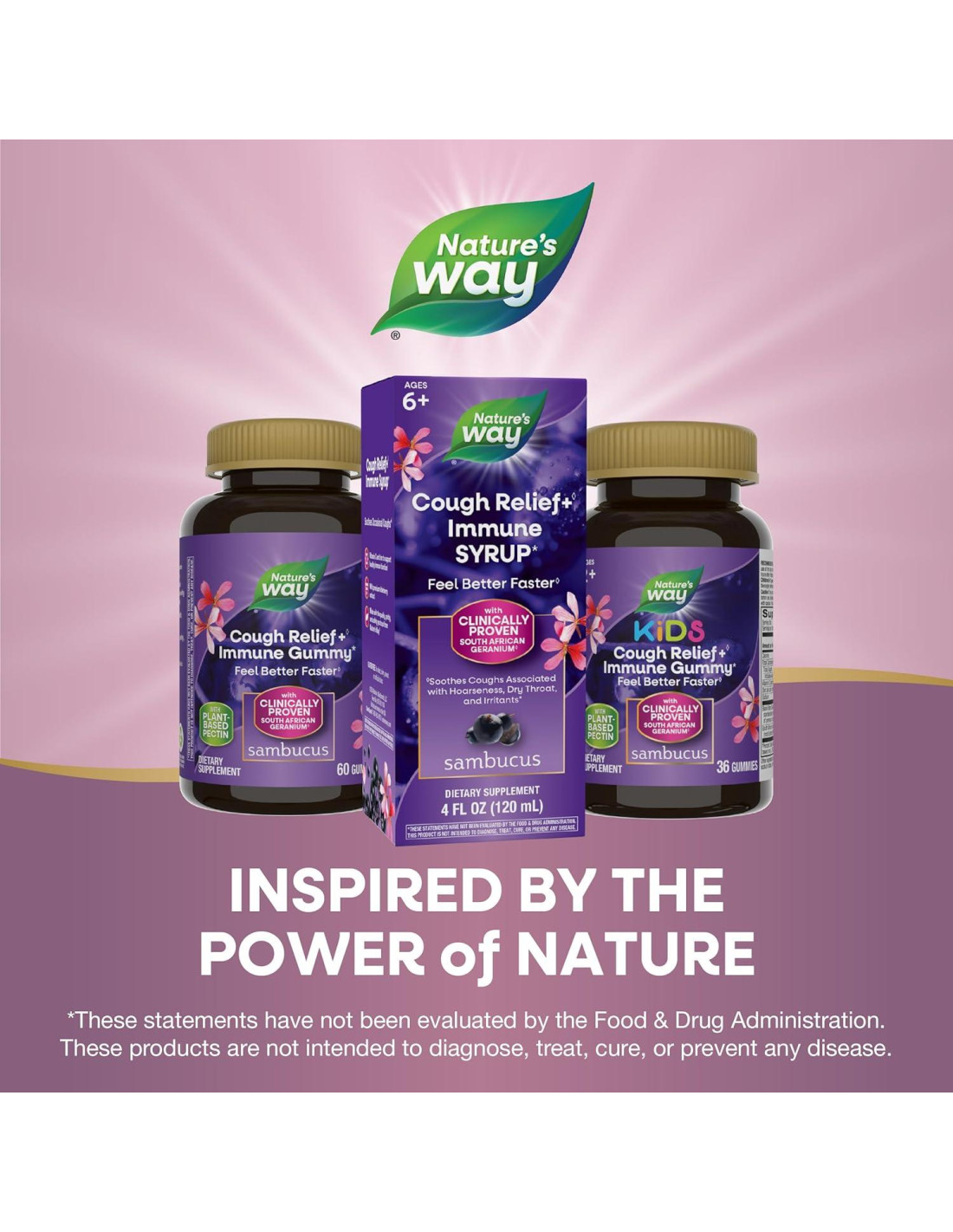 - El Jarabe para la Tos Sambucus +(1) Inmunidad* de Nature's Way une el extracto de raíz de geranio sudafricano con vitamina C y zinc para apoyar la salud inmune.*