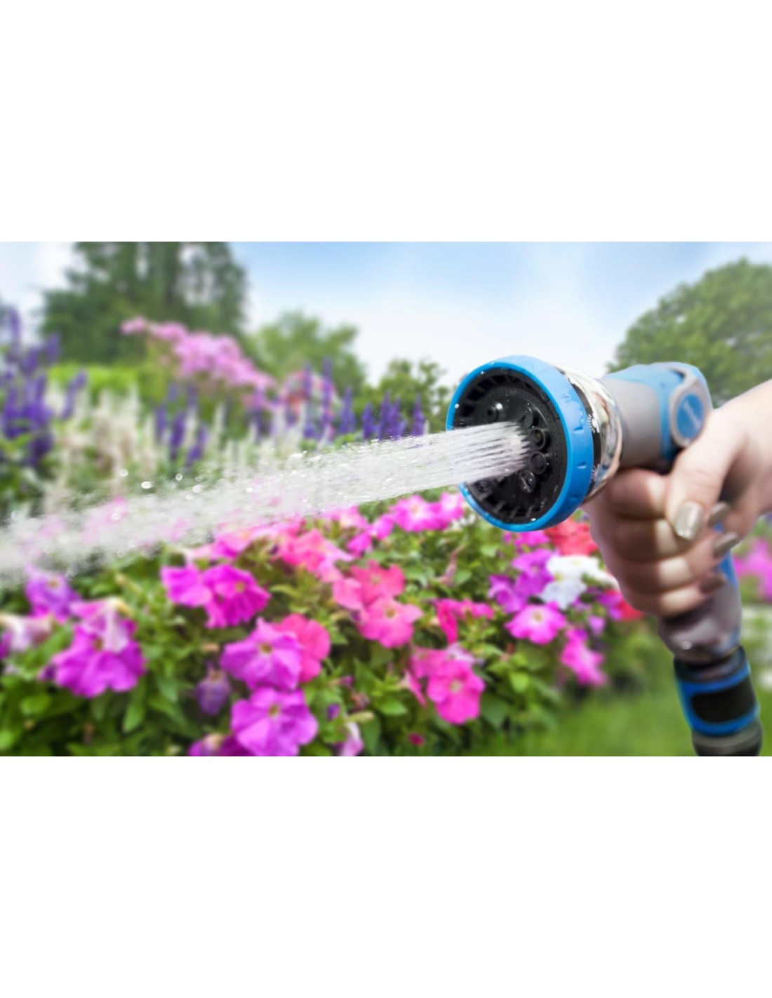 - 10 PATRONES DE RIEGO: Ya sea que necesites un chorro de alta presión para limpiar una superficie dura o una suave ducha delicada para regar el jardín, esta boquilla te cubre. Tiene opciones de patrones de rociado para cada necesidad de riego, incluyendo abanico, niebla, empapador, chorro, y puedes cambiar el patrón fácilmente con un giro del disco de la cabeza.