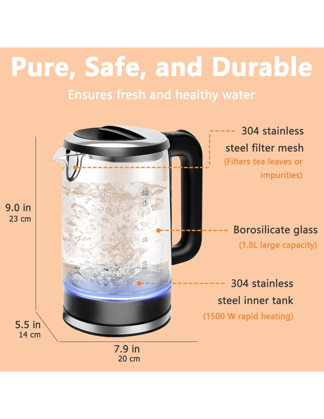 - Hervido rápido - Alimentado por un elemento calefactor de 1500W para un hervido rápido y eficiente en 3-7 minutos. Más seguro y rápido que el microondas o la estufa, ideal para té, café, fórmula para bebés o agua caliente en cualquier momento.