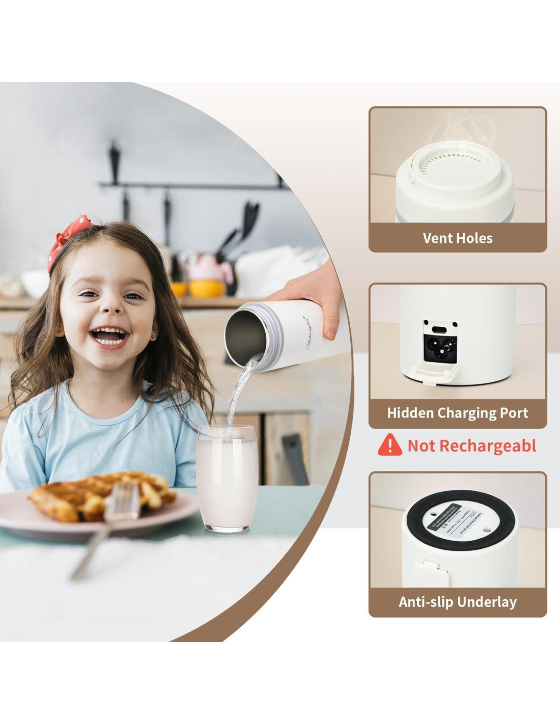 - Prevención de Escaldaduras y Fugas. Diseño superior con válvula de ventilación para eliminar automáticamente el gas de expansión, la taza es triple reforzada para prevenir quemaduras. Almohadilla antideslizante en la parte inferior para evitar vuelcos. Por favor, cubre la tapa para prevenir fugas al hervir agua.