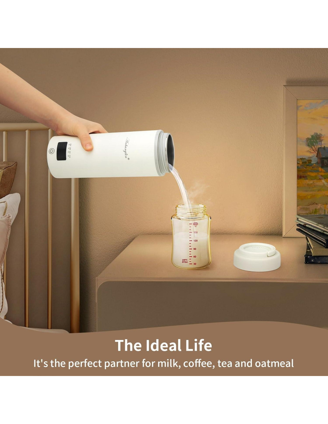 - Requiere enchufe y suministro de energía. No recargable. Si no hay toma de corriente y no hay suministro de energía, las funciones de hervir y mantener caliente no se pueden realizar. Hervir agua a una temperatura establecida y mantener caliente (45 C) durante 12 horas solo cuando esté conectado a una fuente de energía.