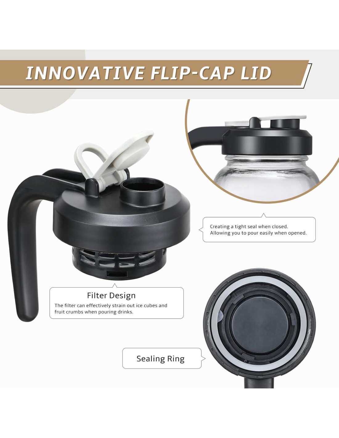 - Diseño Innovador de Tapa: Nuestra jarra cuenta con una tapa única de tapa abatible que asegura un sellado hermético para un uso sin fugas. La tapa está equipada con un filtro incorporado que separa efectivamente los trozos de fruta o cubos de hielo del líquido, proporcionando un flujo suave e ininterrumpido al verter. Además, su mecanismo de fácil apertura hace que acceder a tus bebidas sea muy sencillo mientras mantiene la frescura y el sabor.
