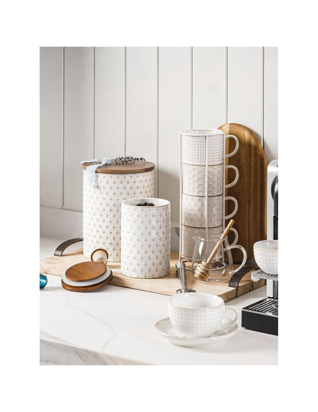 Nuestra misión es hacer que las personas vivan cada vez mejor. Nos enfocamos apasionadamente en la interacción del diseño moderno, la asequibilidad, la calidad y un servicio atento. Expandiremos a cada habitación de la casa, permitiendo a nuestros clientes crear un hogar que sea único para su espacio y estilo de vida. El primer paso que damos es iluminar la mesa de las personas. Déjanos inspirar tu pasión por cocinar y comer. Disfruta de la calidez y la naturaleza de tu vida. Volver a la naturaleza, mantener la paz y sentirnos a nosotros mismos son el espíritu de la Serie de Joanna. Usar bultos en lugar de impresiones, contornear el borde con un color marrón claro que representa la naturaleza. El patrón tridimensional es más vívido en la luz y la sombra, dejándote sentir la naturaleza y la belleza serena desde la vista y el tacto. Afectado por factores como la temperatura, la humedad y el grosor del esmalte, el color y el patrón de cada pieza después de la cocción serán ligeramente diferentes. La tapa cuenta con un anillo de silicona altamente flexible que proporciona un excelente sellado. Sin embargo, el aire atrapado en el interior puede empujar hacia arriba, dificultando el cierre adecuado. Para asegurar un sellado hermético, presiona firmemente durante 1-2 segundos después de colocar la tapa. O puedes colocar la tapa lentamente en un ángulo ligero para permitir que el aire escape. Dado que las tapas están hechas de madera natural, que tiene su propio grano y color únicos, las ligeras variaciones en la apariencia son naturales e inevitables. Un almacenamiento adecuado es esencial pero a menudo se pasa por alto. El azúcar y los granos secos necesitan protección contra la humedad, mientras que los granos de café y las hojas de té deben estar protegidos de la luz y mantenerse a una temperatura adecuadamente fresca. Los contenedores de almacenamiento de Joanna proporcionan la solución perfecta. Fabricados con cerámica gruesa con una tapa de madera y un anillo de silicona sellado, estas jarras son herméticas, a prueba de humedad y aisladas. Con el elegante esmalte blanco ártico y delicados patrones en relieve, también sirven como decoraciones elegantes. 7.1" Soporte para Utensilios, Portavelas, Reposaplatos en relieve, Reposaplatos con Letra, Reposaplatos con Soporte, Reposaplatos Versátil, Reposaplatos Clover.