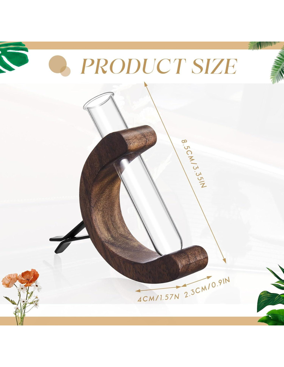 - Construcción Robusta: nuestro clip de jarrón para automóvil está fabricado con material de madera que ha sido tratado con aceite de cera; Esto no solo asegura longevidad, sino que también proporciona un acabado brillante para una apariencia elegante; El elemento de vidrio añade un atractivo estético único, demostrando que no solo es funcional sino también visualmente agradable