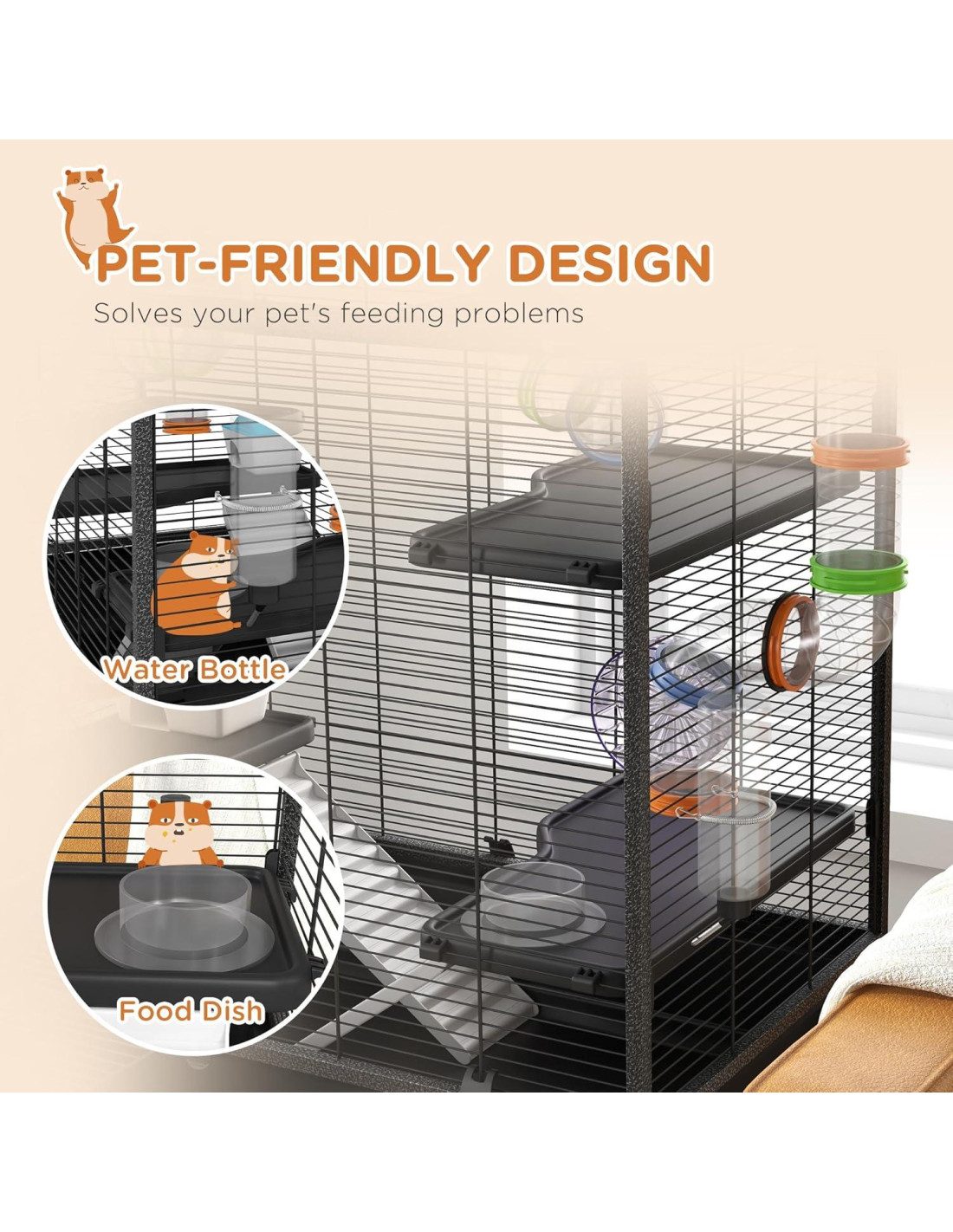 - Diseño Accesible: El diseño de esta jaula para ratas asegura la seguridad y comodidad de tu mascota. Cuenta con puertas frontales y superiores convenientes, lo que permite un fácil acceso a tu mascota y una limpieza simplificada.