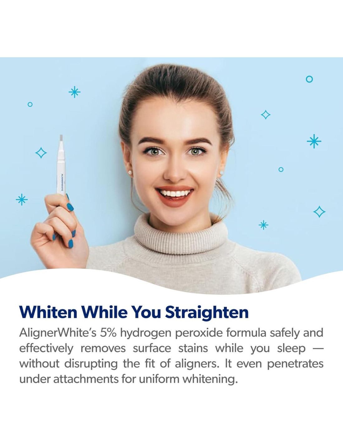 - El Único Bolígrafo Blanqueador de Dientes para Alineadores y Retenedores: Hecho específicamente para quienes usan alineadores y retenedores. La fórmula de peróxido de hidrógeno al 5% de AlignerWhite elimina de manera segura y efectiva las manchas superficiales mientras duermes - sin interrumpir el ajuste de los alineadores. Incluso penetra bajo los accesorios para un blanqueo uniforme. Simplemente aplica el gel sin desorden directamente en las bandejas antes de dormir.