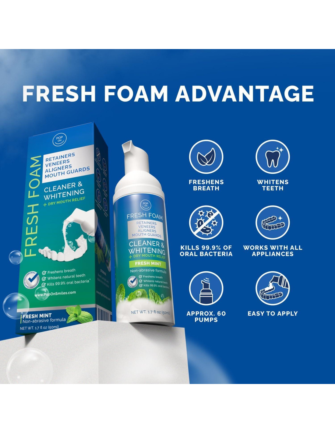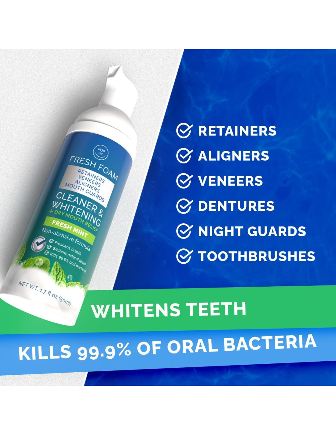 - Adecuado para Todos los Aparatos Dentales: Pop On Fresh Foam actúa como una solución limpiadora de alineadores y retenedores para aparatos dentales removibles, espuma blanqueadora para alineadores incluyendo retenedores, protectores bucales, protectores nocturnos, carillas, dentaduras y más. Es tu solución todo en uno para el cuidado bucal sobre la marcha.