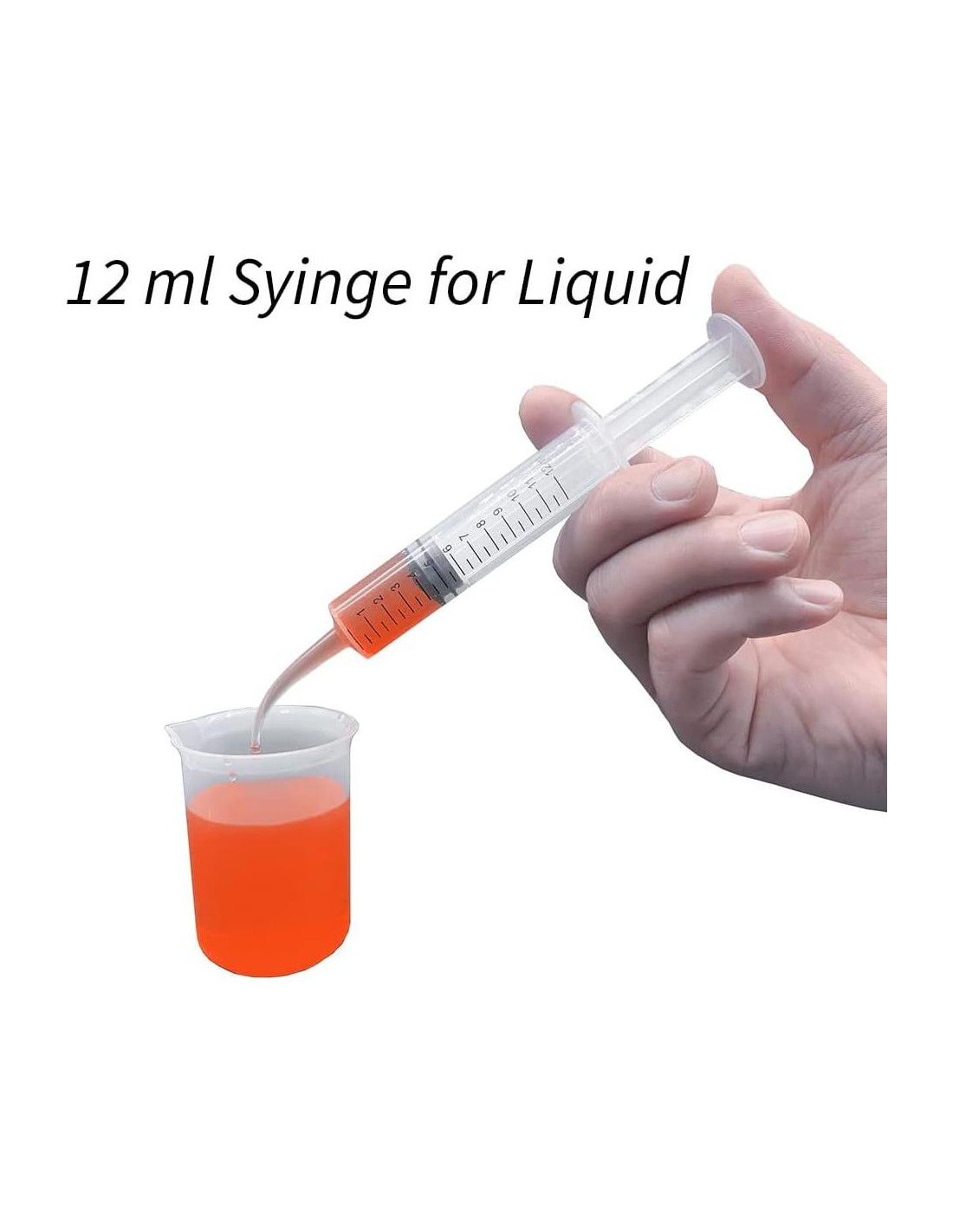- Paquete de 5 jeringas de 12ml con punta curvada y escala de medición.
