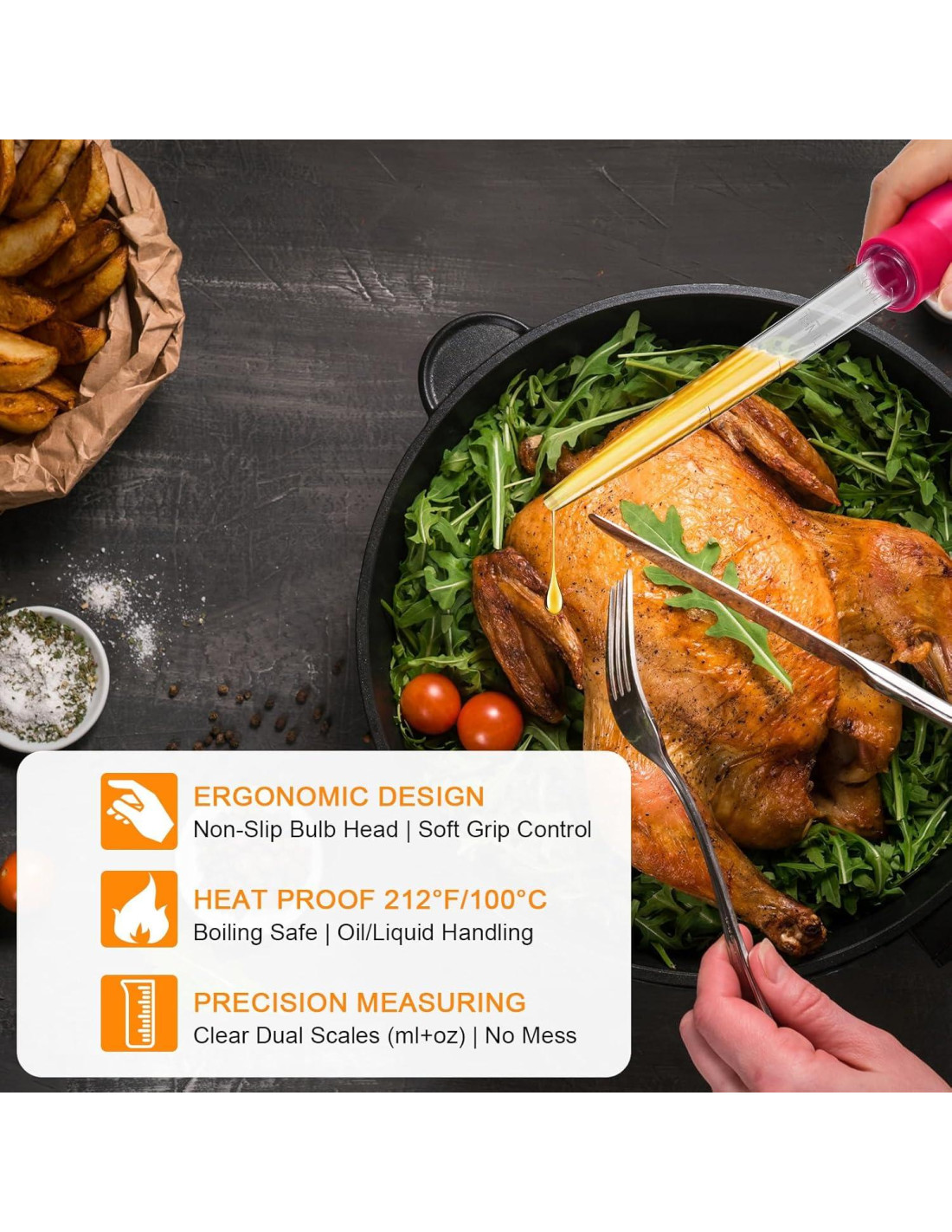 - Consejos de uso: es fácil para ti apretar la parte superior y usar la succión para absorber los jugos según sea necesario para verter sobre el pavo, jamón u otros platos.