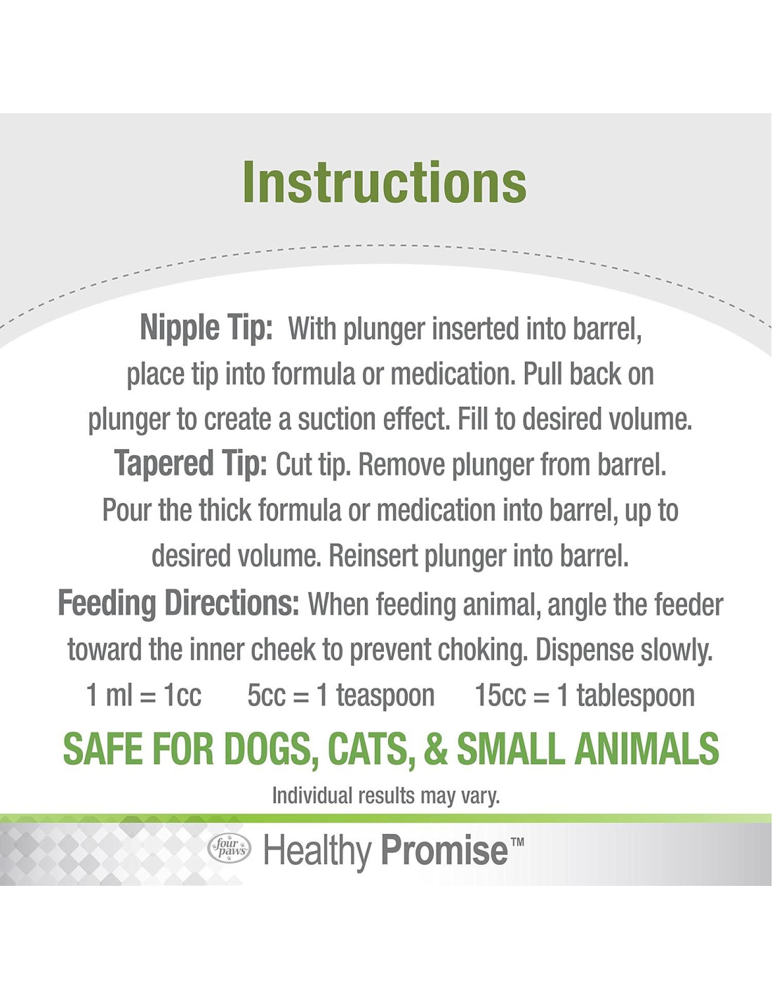 Cuatro Patas ha estado ayudando a los padres de mascotas y a los miembros de la familia de cuatro patas a prosperar juntos durante más de 50 años. Impulsados por la pasión de mantener a nuestros mejores amigos peludos felices y saludables, los suplementos y productos de cuidado y sanación de Promesa Saludable ayudan a proporcionar a nuestras mascotas una vida saludable, activa y plena. Recomendado por veterinarios, el Alimentador Fácil Promesa Saludable es un dispensador seguro y efectivo para administrar por vía oral fórmulas líquidas y medicamentos. Esta jeringa de medicina para mascotas incluye dos puntas: una punta de pezón que es ideal para líquidos más delgados y una punta cónica para líquidos más espeses o pastas. La jeringa oral para mascotas cuenta con marcas de medición para ayudar a proporcionar una dosis precisa y exacta. Además, esta jeringa de alimentación para perros, gatos y animales pequeños es libre de BPA y apta para lavavajillas. ¡Agrega los productos de cuidado y sanación para mascotas de Promesa Saludable a la rutina de tu amigo peludo!
