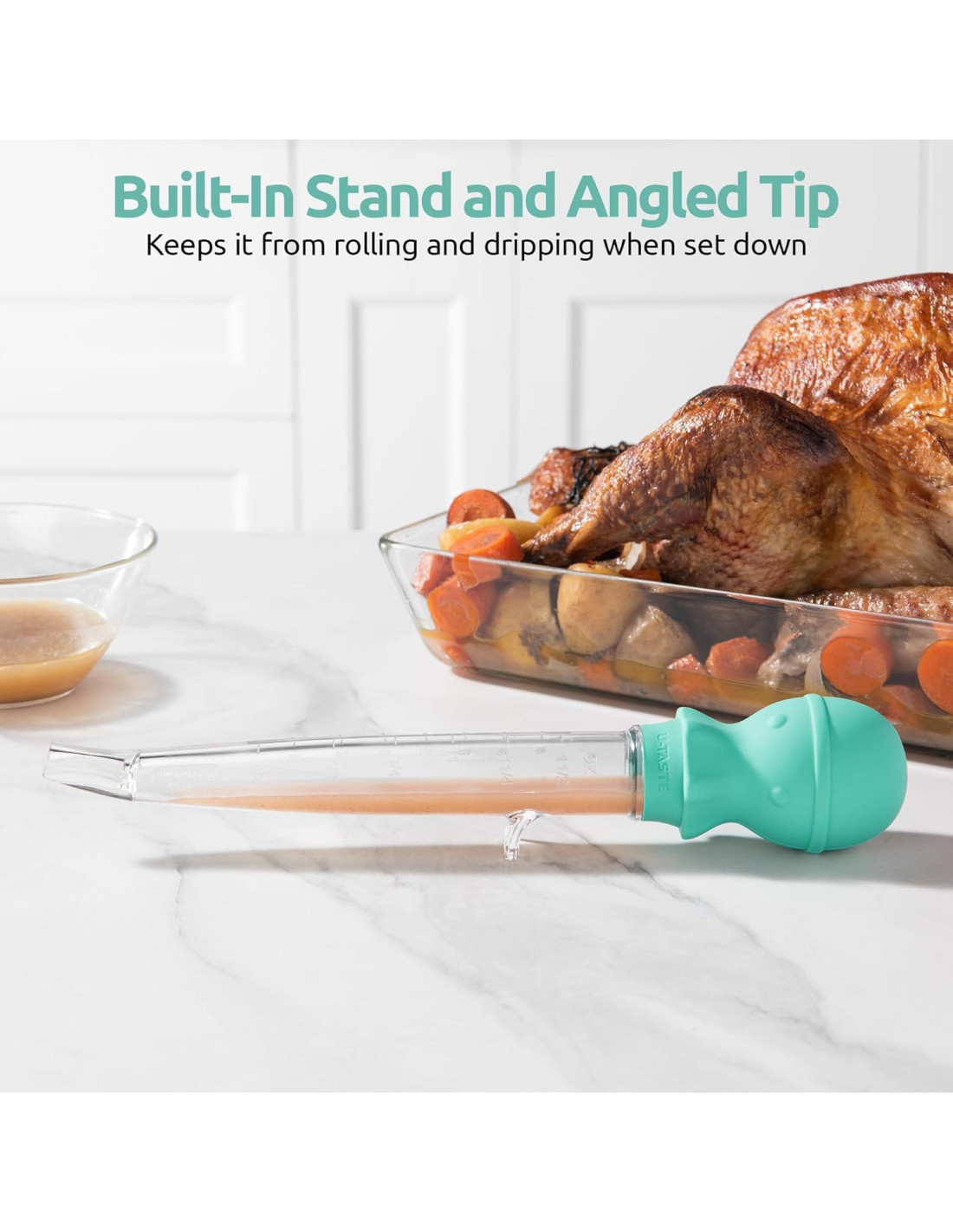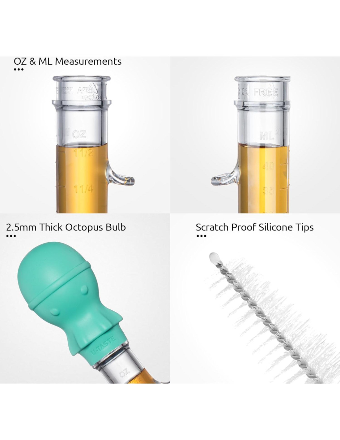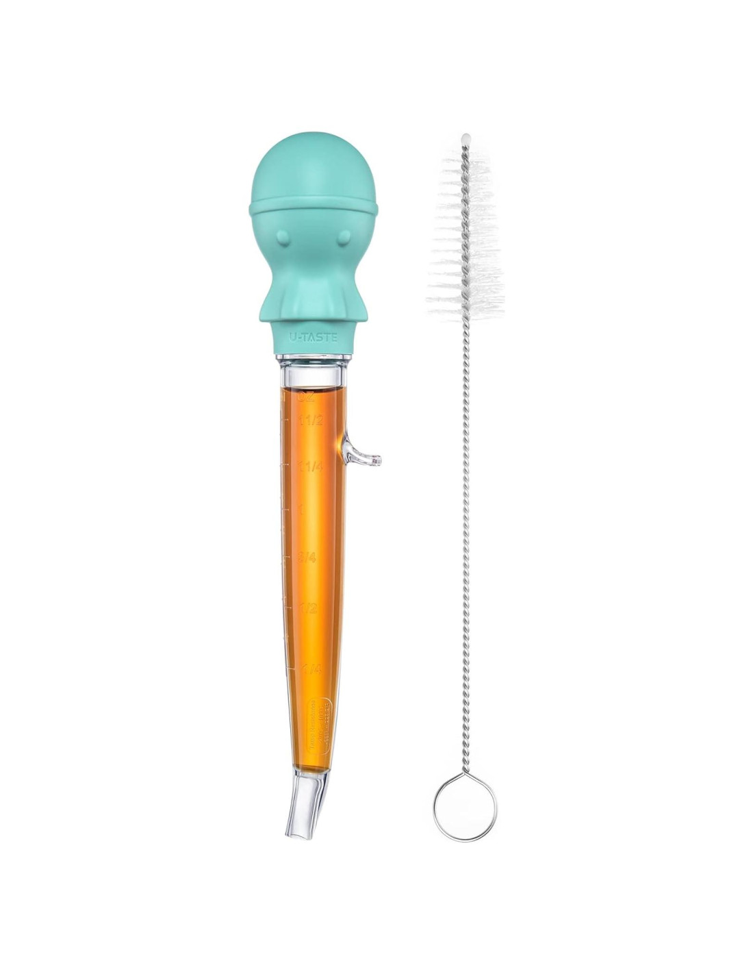 - [Silicona y Tritan Resistente al Calor] La jeringa de pavo U-Taste está construida para resistir jugos calientes. Sin problemas de derretimiento. El lindo bulbo de pulpo está hecho de silicona resistente al calor de 600F (315.6C) y cuerpo de tritan de grado alimenticio (Tritan es un PCTG resistente a temperaturas con una resistencia a temperaturas de -4~228.2F (-20~109C)). La textura clara como cristal te permite saber con qué estás basteando la comida. Puedes usarlo para bastear pavo o jamón, o para extraer grasa de un pastel de carne al horno.