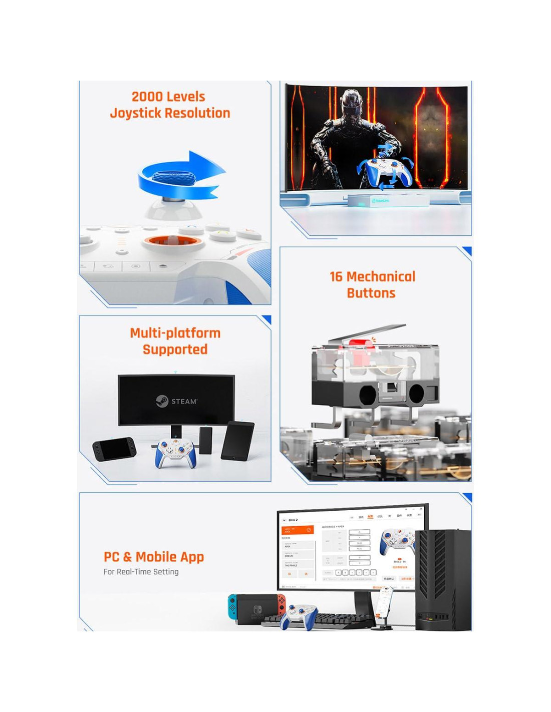 - Excelente Diseño Táctil: Agarre ergonómico, joystick de resistencia magnética TMR, barra de clavos adhesivos ALPS y 16 botones mecánicos completamente funcionales proporcionan una excelente sensación táctil y eliminan el riesgo de rotura.