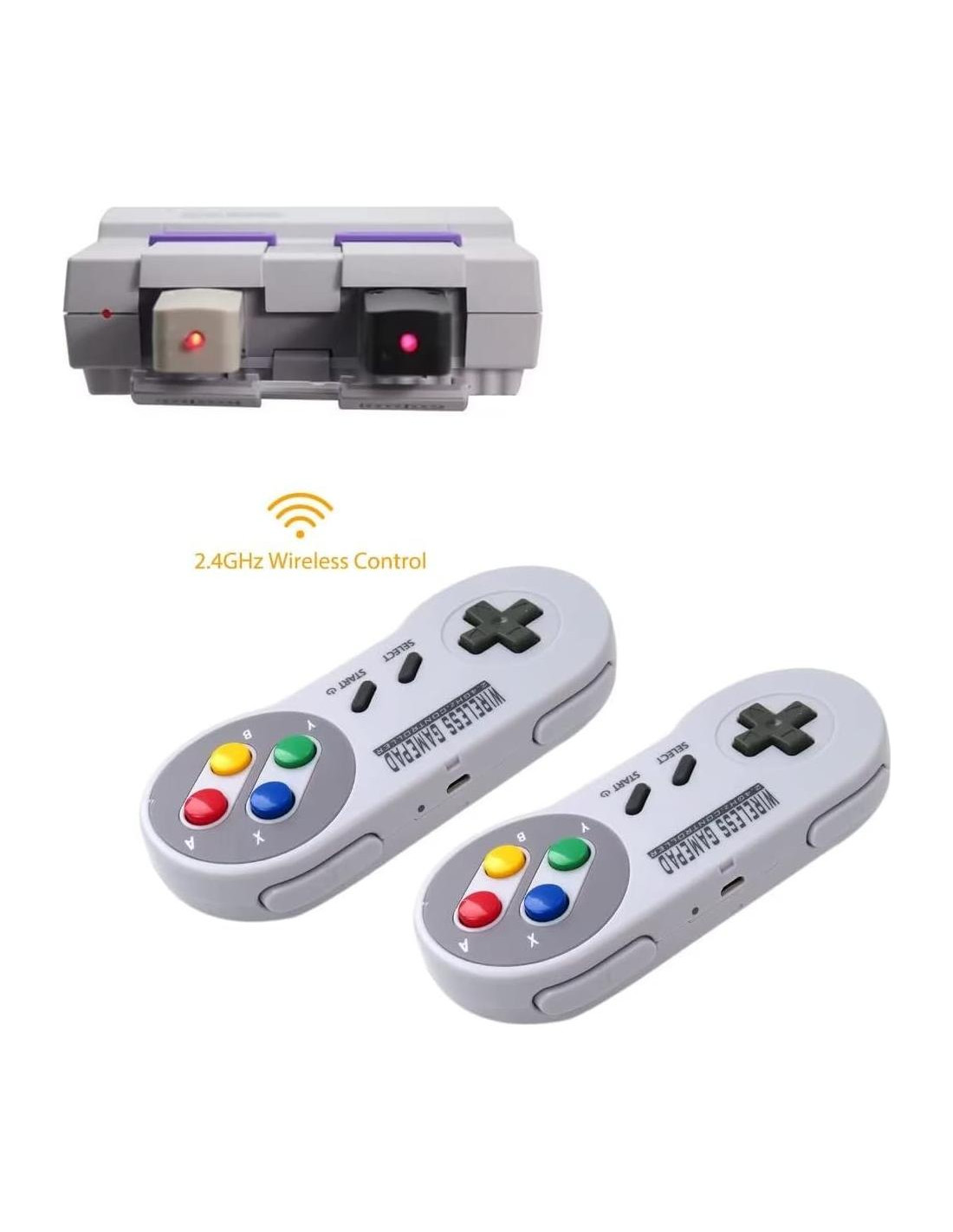 Descripción: Tipo: Controlador Inalámbrico Sin Cable Conectividad: USB Distancia de Control Inalámbrico: hasta 7.32 metros Batería de litio recargable: Juega durante aproximadamente 100 horas con una sola carga Controlador retro inalámbrico 2.4G Compatible con: Adecuado para la versión clásica de SNES (SNES mini) o la versión clásica de SFC (SFC mini) No es adecuado para versiones anteriores de SNES y no se puede emparejar con Consolas Clon. Tenga en cuenta que el controlador no es compatible con consolas de los años 80 y 90 Dispositivos Soportados (con dispositivos de almacenamiento USB): para PC, computadora portátil; MacBook; para smartphone Android: conectado a través de cable USB OTG, Raspberry Pi (retro pie) Emuladores de juegos soportados: para SNEX9X, ZSNEX, OpenEmu (solo se soporta OS X), Retropie (para Raspberry Pi) Sistemas operativos soportados: para Windows 98, ME, Vista, 2000, 2003, XP, 7, 8, 8.1, 10; Linux UBUNTU, Linux Mint; Mac OS X y superior Sistemas operativos de retrogaming: RetroPie, Recalbox, Happi Game Center, Lakka, ChameleonPi, Piplay Función adicional: El adaptador USB es compatible con la mayoría de los emuladores en Windows, Mac, Linux, Raspberry Pi3 o dispositivos Android al cambiar a modo de entrada X (Seleccionar + L + X) y modo de entrada D (Seleccionar + L + Y) Proporciona función Turbo (mantenga presionado Seleccionar + (A/B/X/Y) para encender/apagar Solo para adaptador USB) Paquete Incluido: 2Pcs Controlador de Juego Inalámbrico