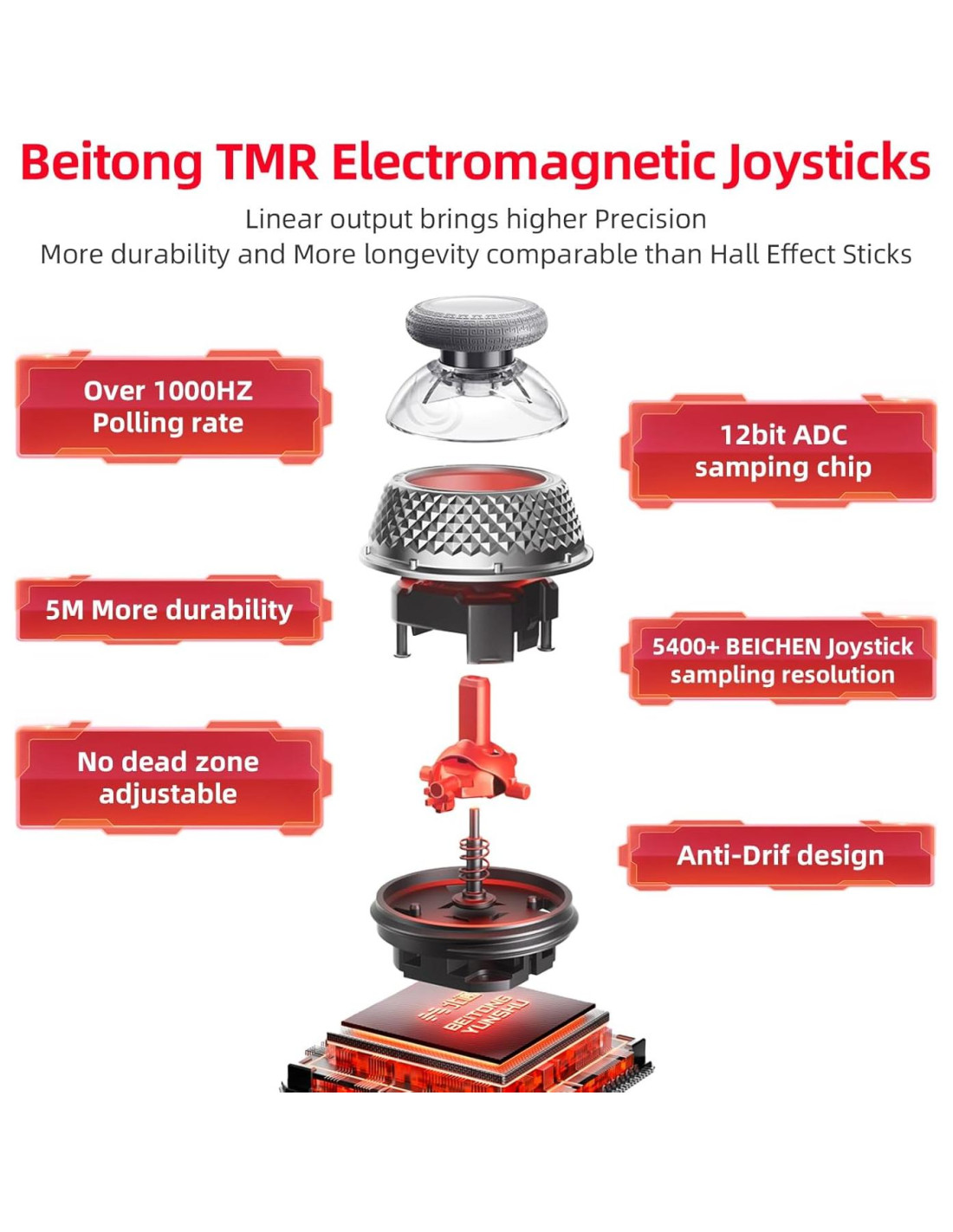 - [Joystick TMR Ajustable en Fuerza & Gatillos TMR] Los joysticks TMR combinan durabilidad, precisión y bajo consumo de energía, con tensión ajustable fácilmente girando el anillo de fuerza durante el juego para encontrar tu sensación perfecta (30-90gf). Con menos del 1% de deriva y más de 5400 de resolución. Los Gatillos TMR rápidos pueden alcanzar hasta 0.1mm de precisión, sin contacto y sin fricción.