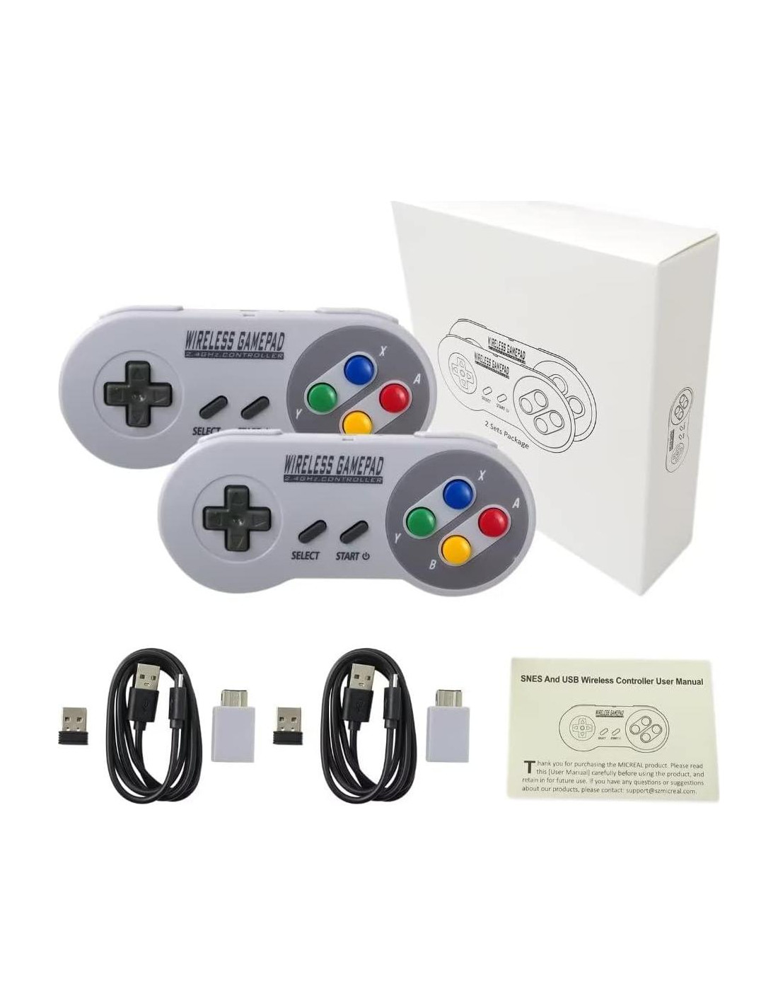 Descripción: Tipo: Controlador Inalámbrico Sin Cable Tecnología de Conectividad: USB Distancia de Control Inalámbrico: hasta 7.32 metros Batería de litio recargable: Juega durante aproximadamente 100 horas con una sola carga Controlador retro inalámbrico 2.4G Compatible con: Adecuado para la versión clásica de SNES (SNES mini) o la versión clásica de SFC (SFC mini) No es adecuado para versiones anteriores de SNES y no se puede emparejar con Consolas Clon. También tenga en cuenta que el controlador no es compatible con consolas de los años 80 y 90 Dispositivos Soportados (con dispositivos de almacenamiento USB): para PC, computadora portátil, computadora portátil; MacBook para smartphone Android: conectado a través de cable USB OTG, Raspberry Pi (retro pie) Emuladores de juegos soportados: para SNEX9X, ZSNEX, OpenEmu (solo se admite OS X), Retropie (para Raspberry Pi) Sistemas operativos soportados: para Windows 98, ME, Vista, 2000, 2003, XP, 7, 8, 8.1, 10; Linux UBUNTU, Linux Mint; Mac OS X y superior para sistemas operativos de retrogaming: RetroPie, Recalbox, Happi Game Center, Lakka, ChameleonPi, Piplay Función adicional: El adaptador USB es compatible con la mayoría de los emuladores en Windows, Mac, Linux, Raspberry Pi3 o dispositivos Android al cambiar a modo de entrada X (Seleccionar + L + X) y modo de entrada D (Seleccionar + L + Y) Proporcionar función Turbo (presione y mantenga Seleccionar + (A/B/X/Y) para encender/apagar Solo para adaptador USB) Paquete Incluido: 2Pcs Controlador de Juego Inalámbrico